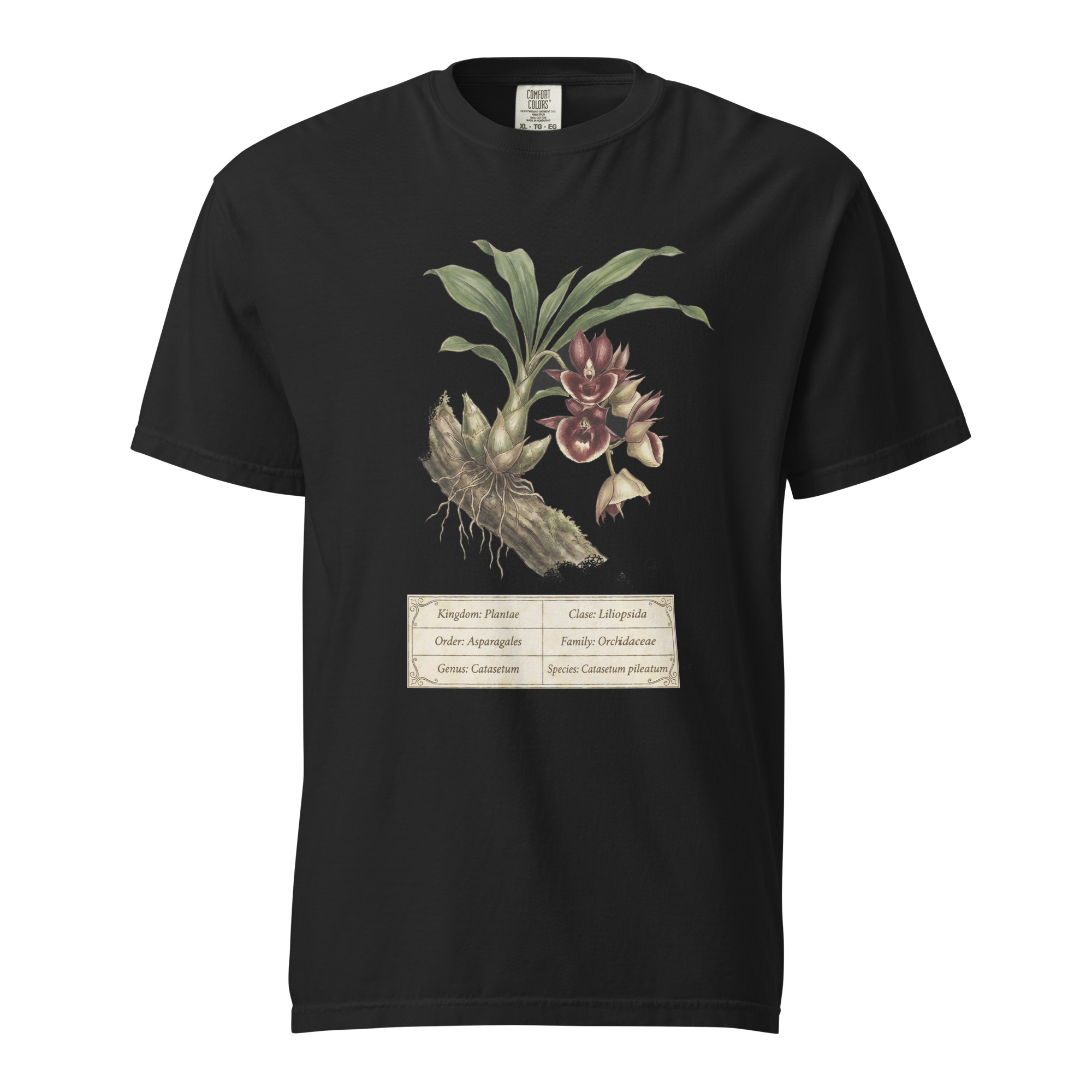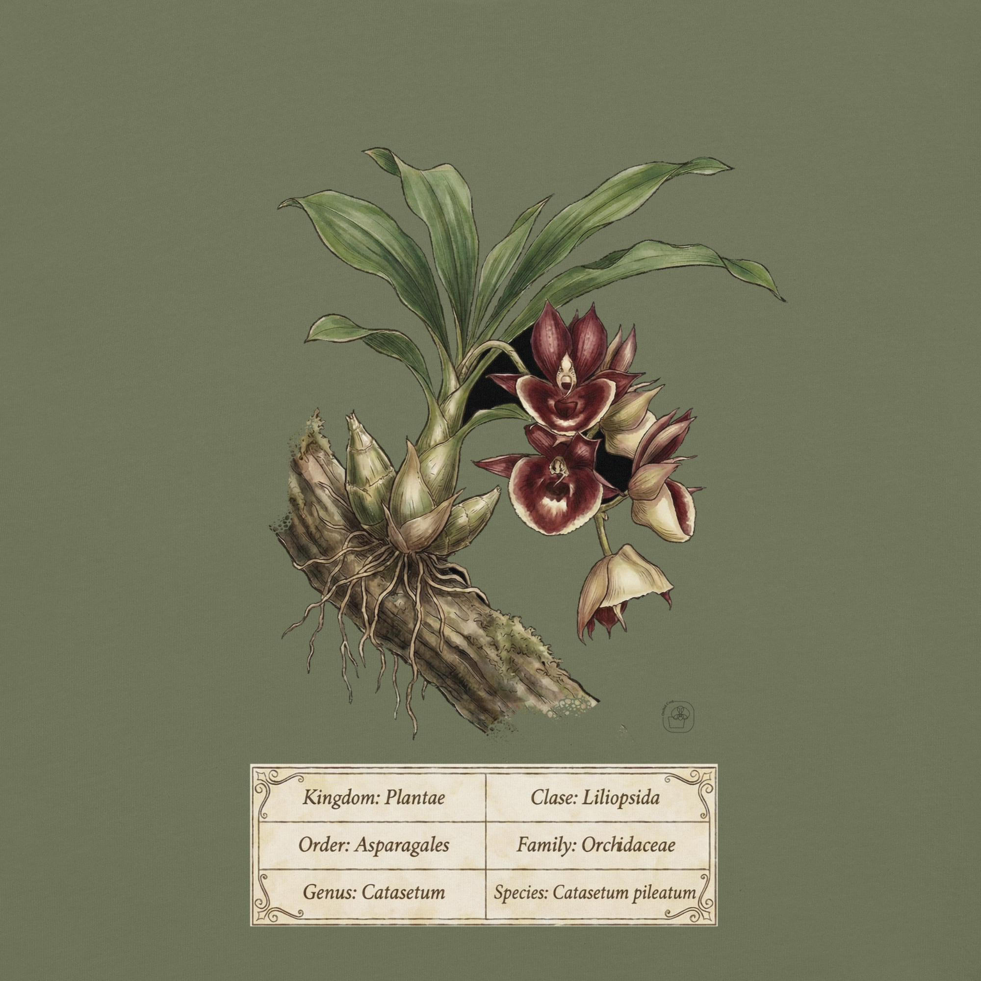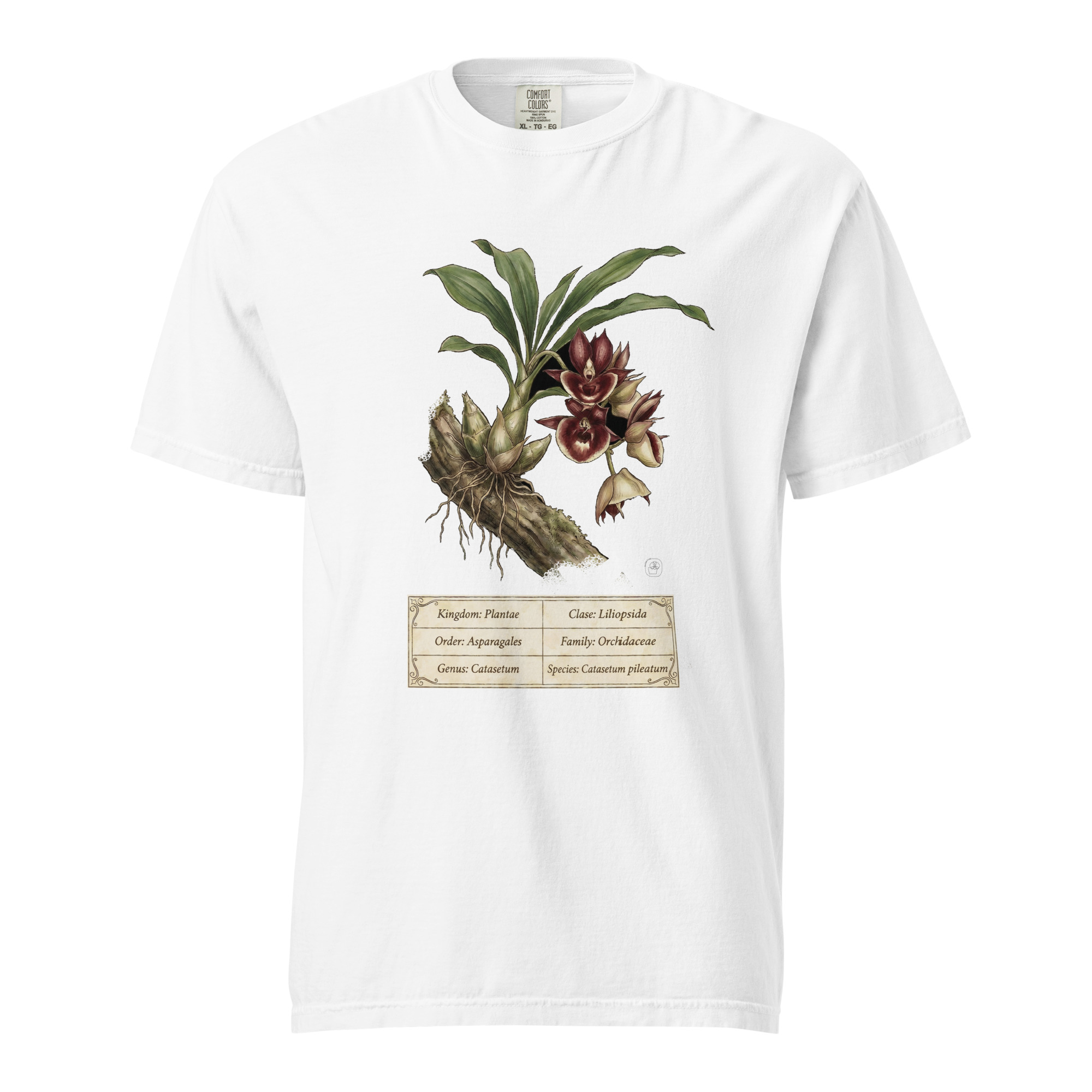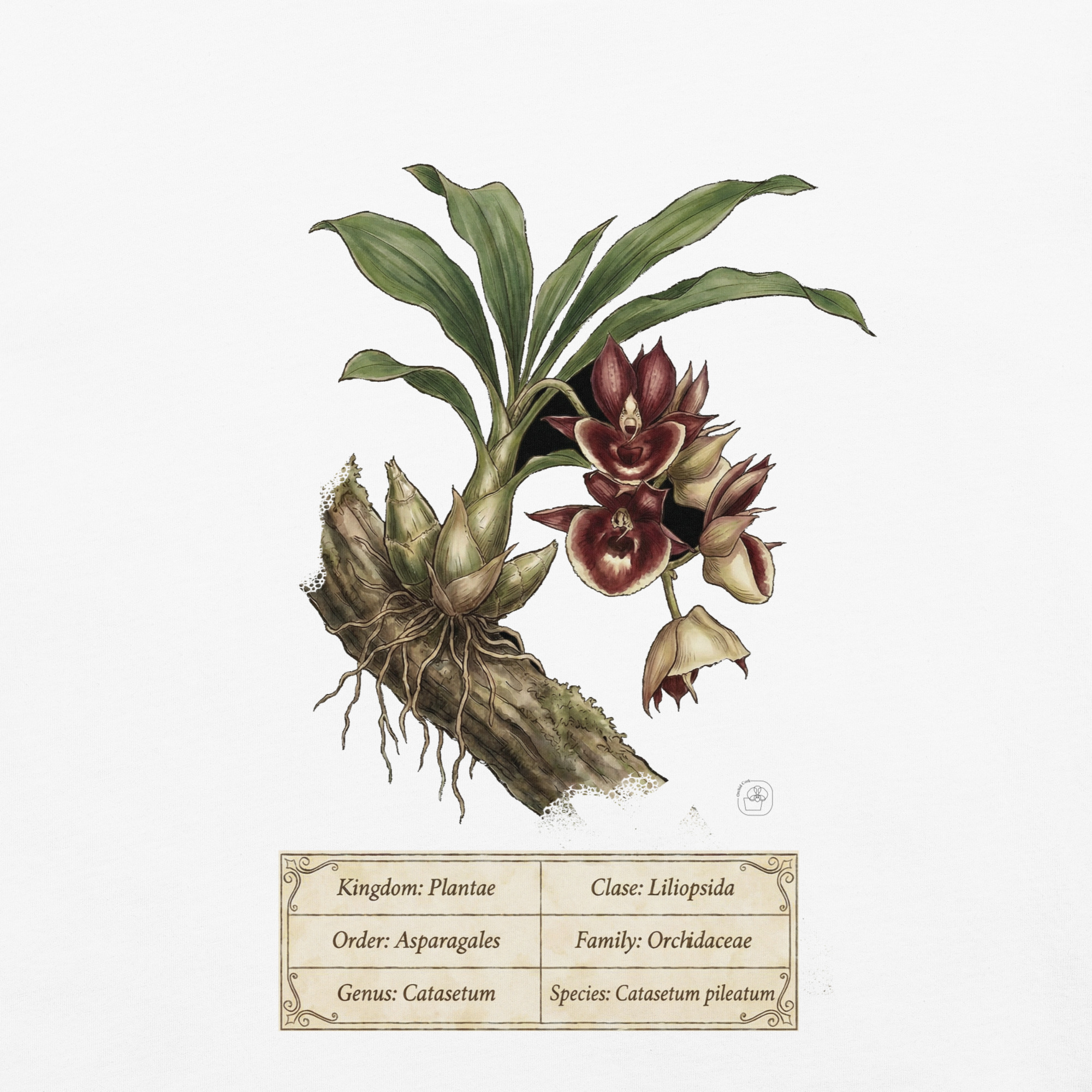 This t-shirt features a detailed illustration of Catasetum pileatum, inspired by 19th-century scientific botanical plates: clear compositions, precise linework, and a naturalistic aesthetic focused on the real structure of the plant.