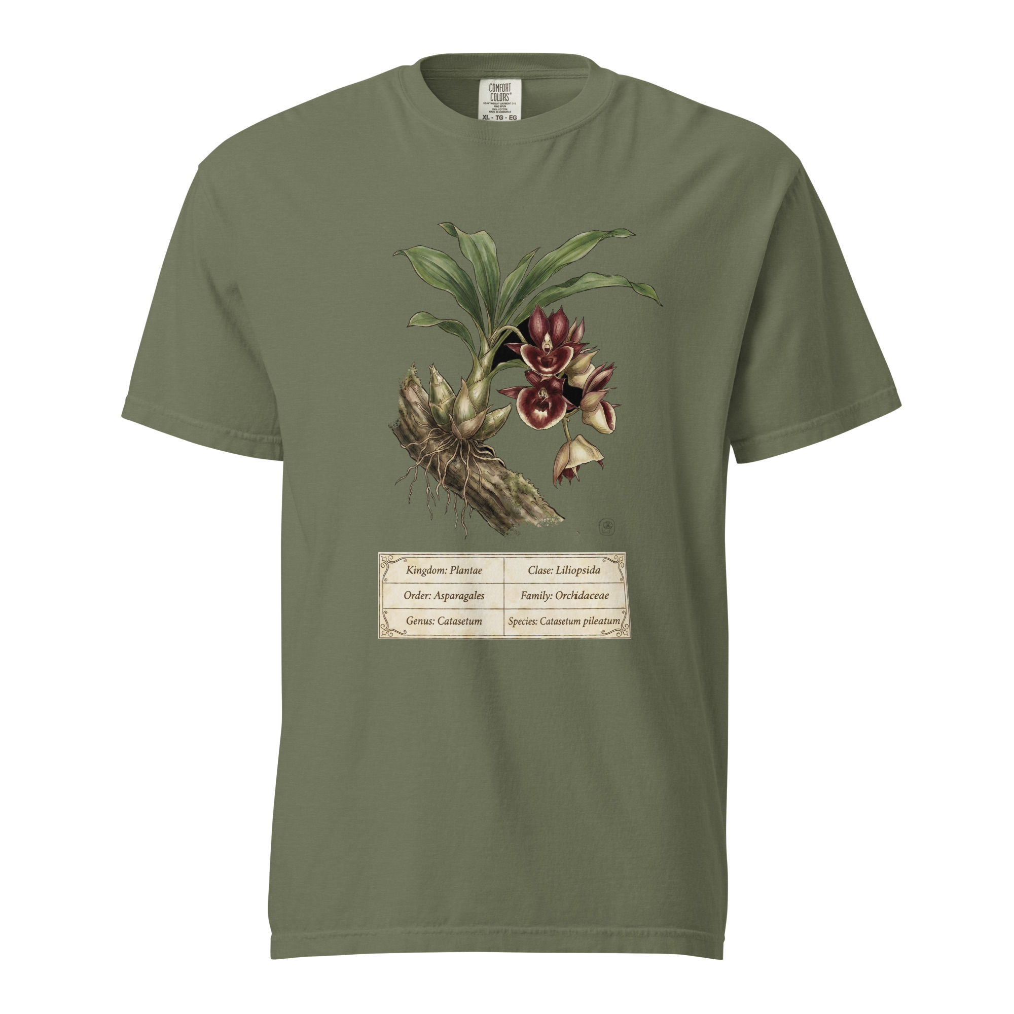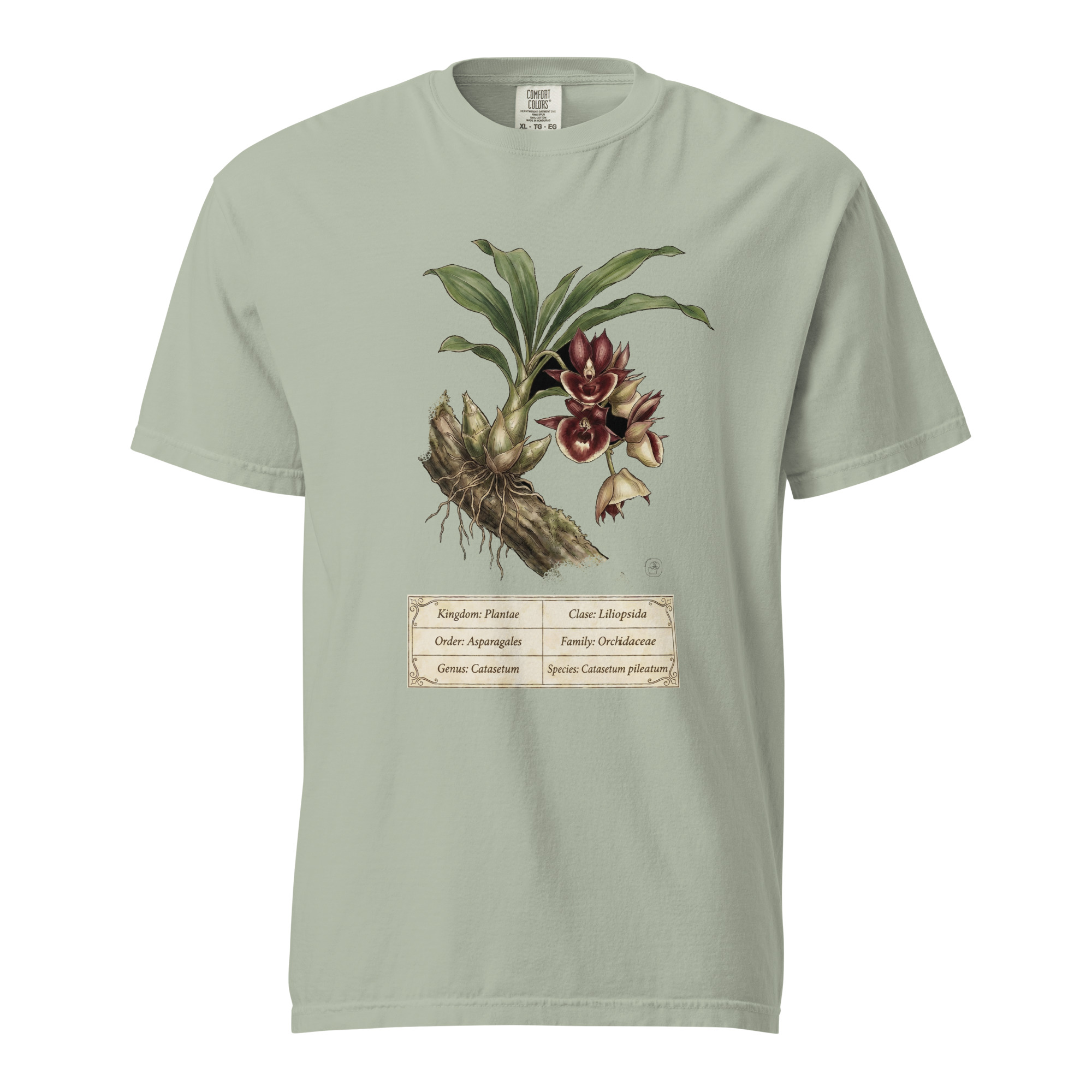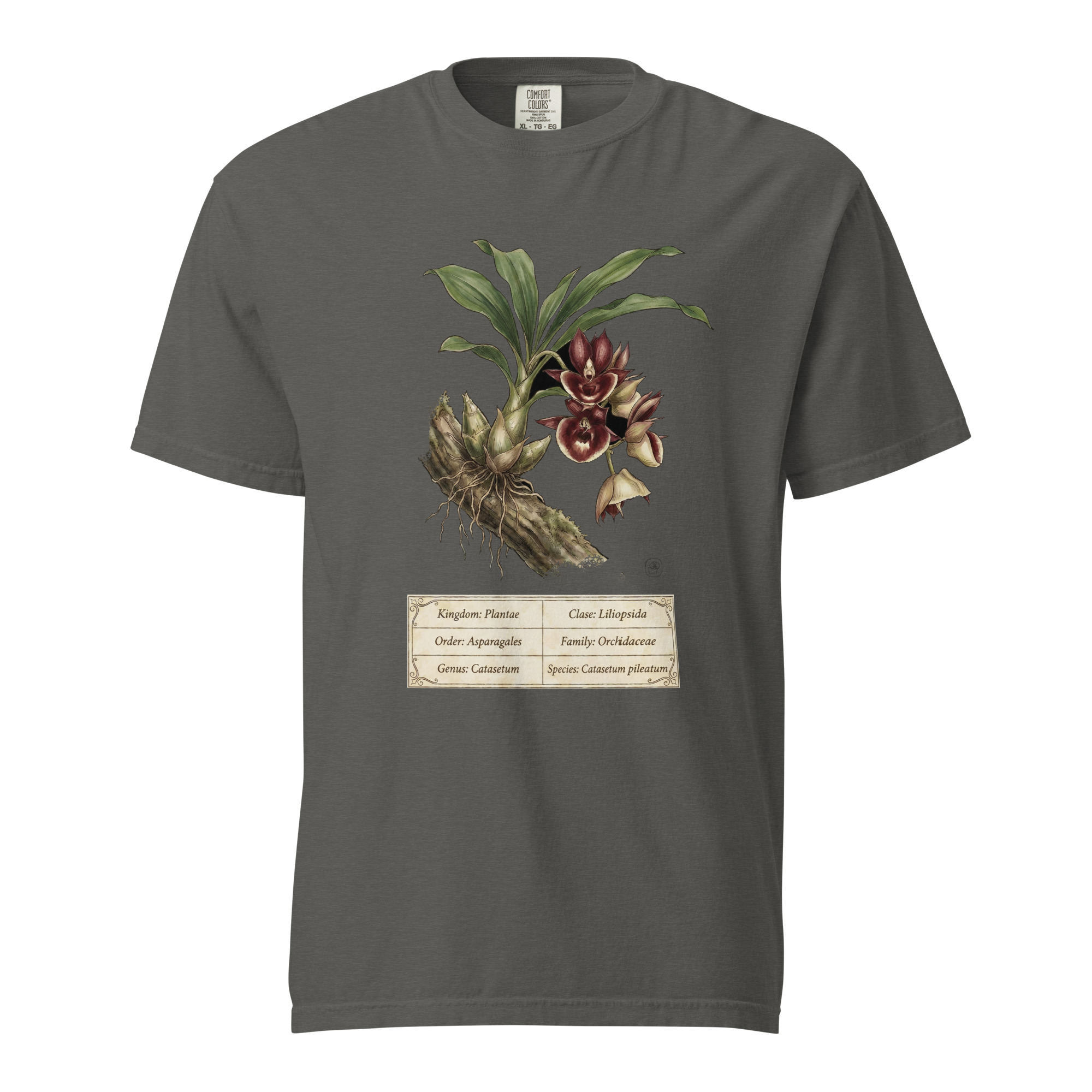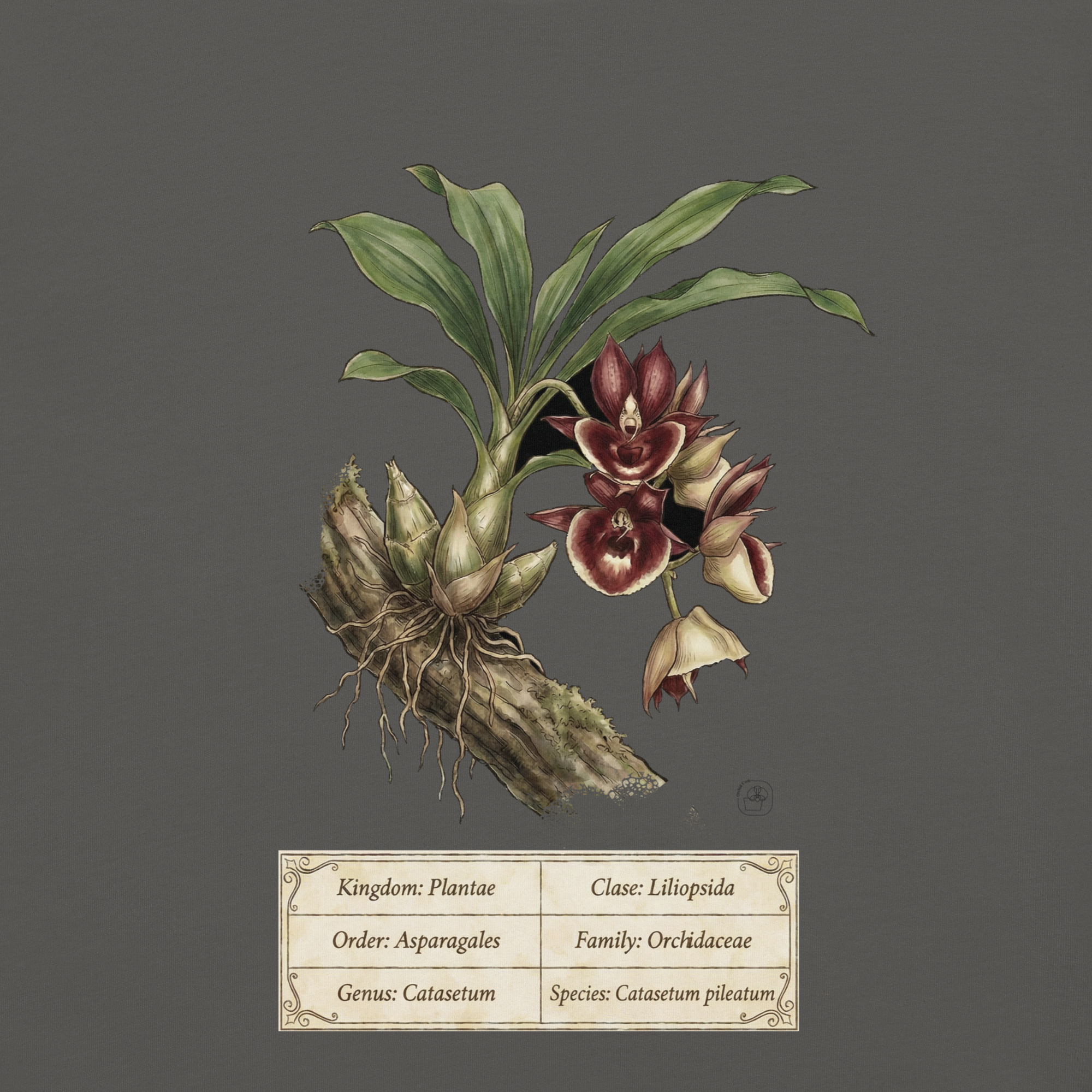 This t-shirt features a detailed illustration of Catasetum pileatum, inspired by 19th-century scientific botanical plates: clear compositions, precise linework, and a naturalistic aesthetic focused on the real structure of the plant.