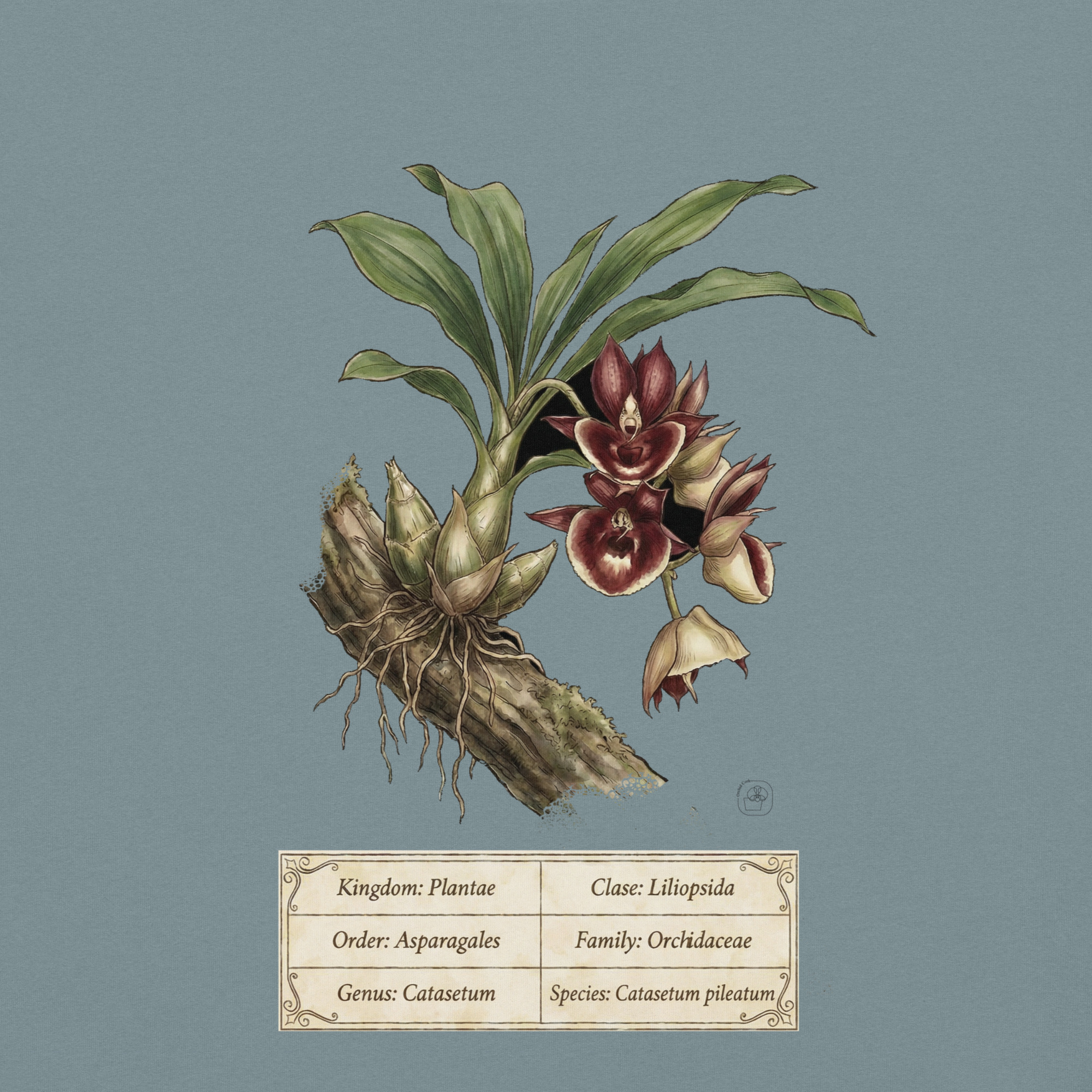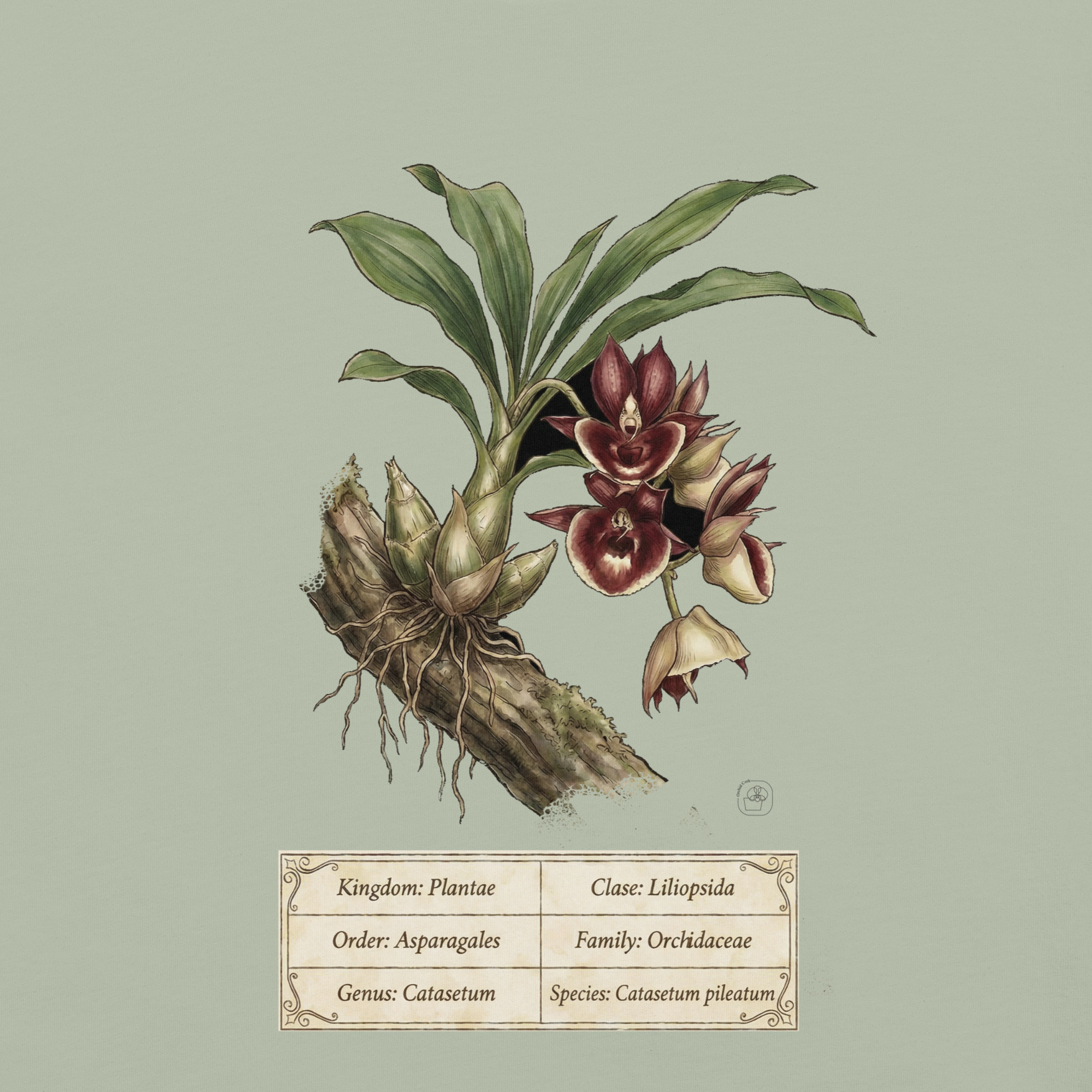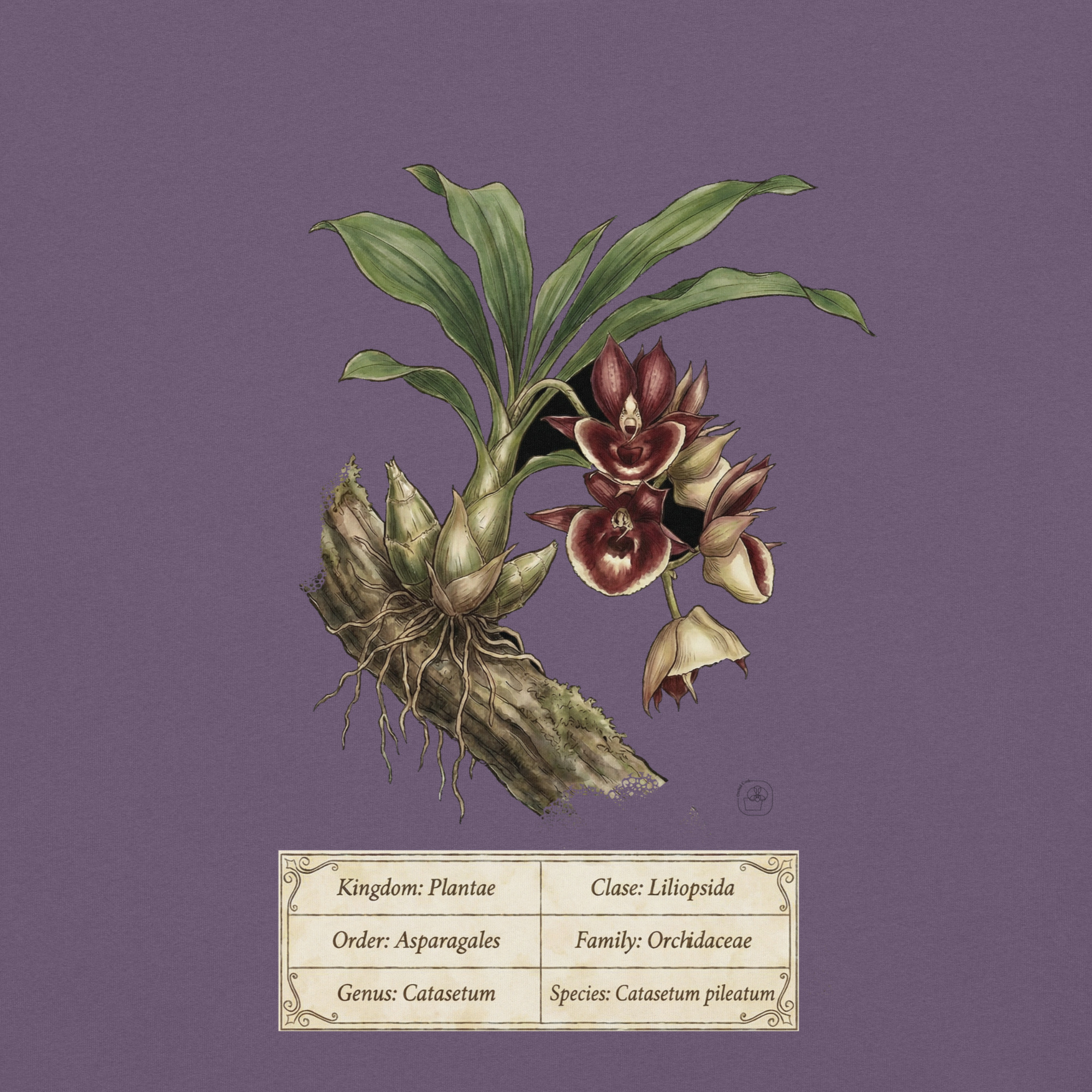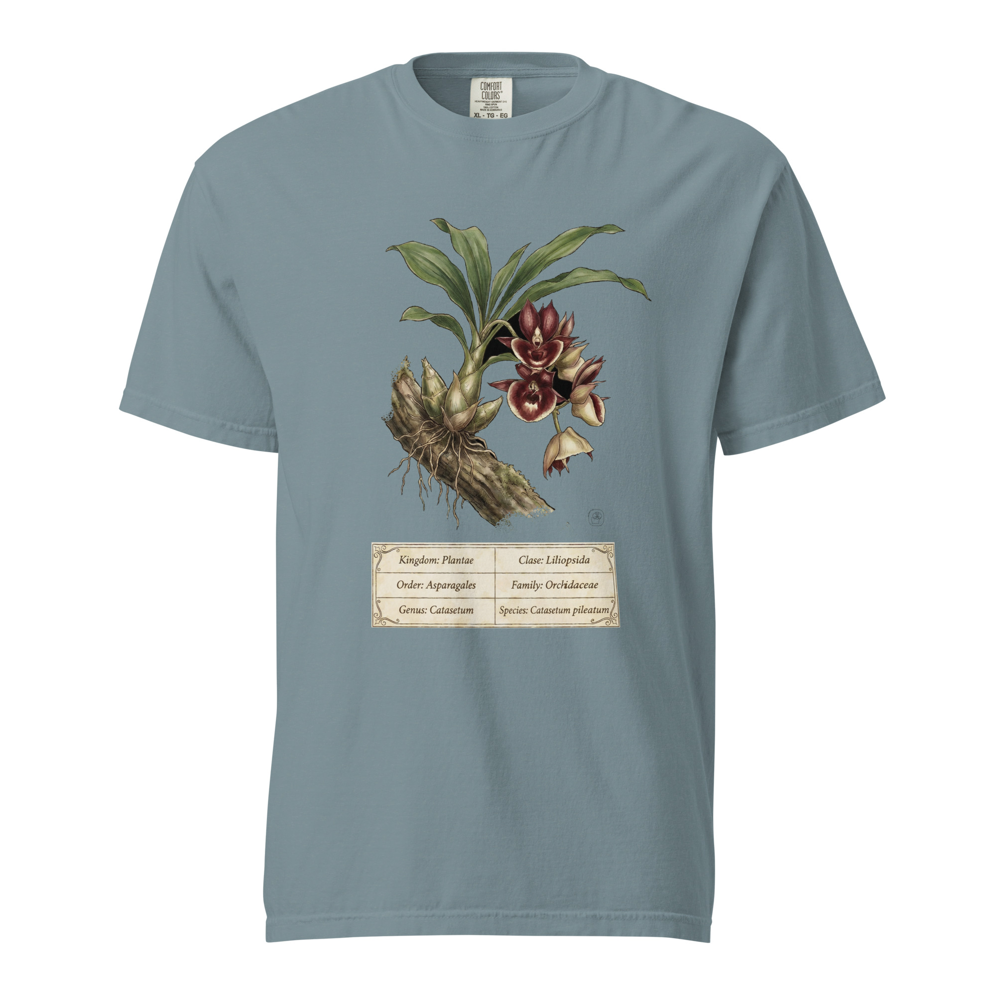 This t-shirt features a detailed illustration of Catasetum pileatum, inspired by 19th-century scientific botanical plates: clear compositions, precise linework, and a naturalistic aesthetic focused on the real structure of the plant.