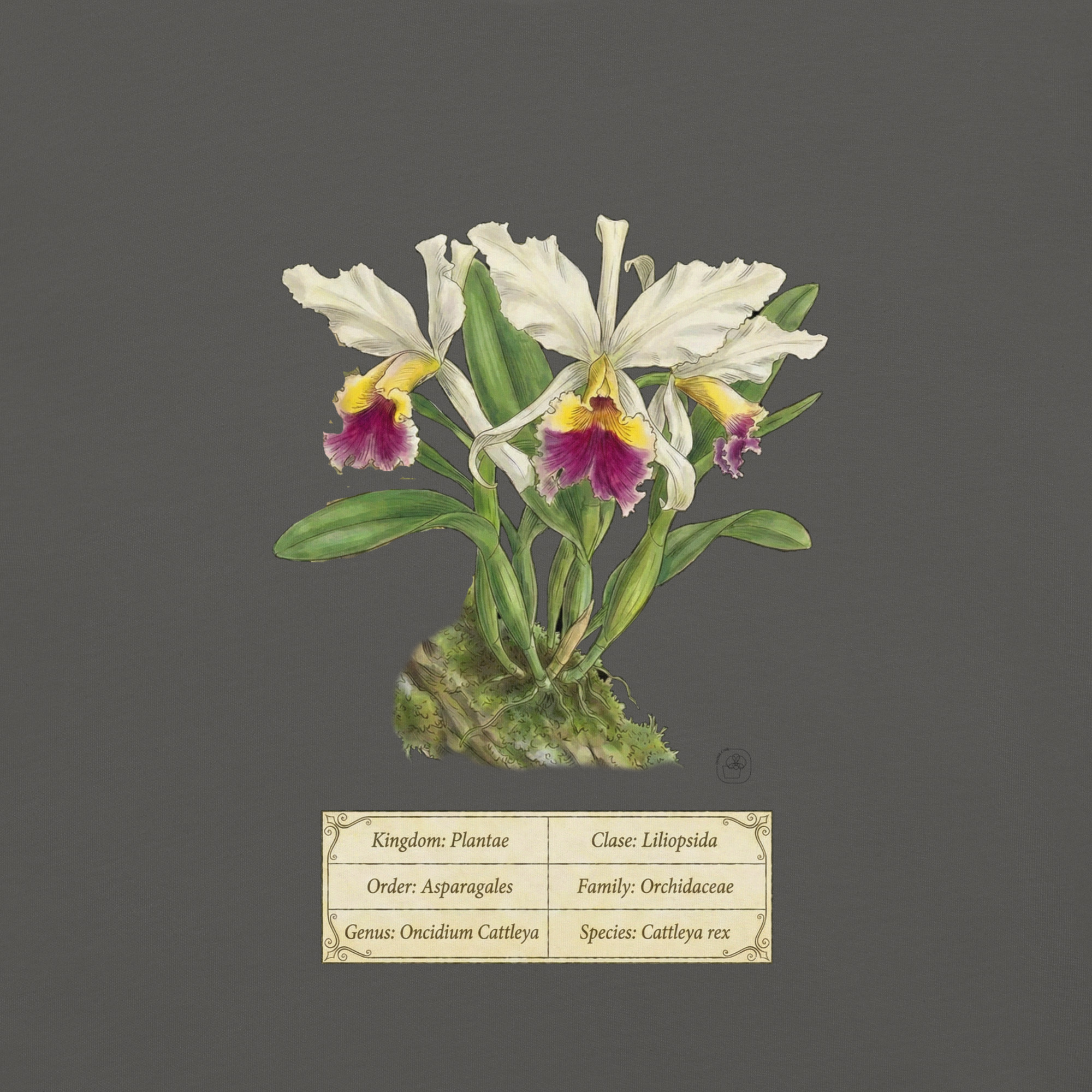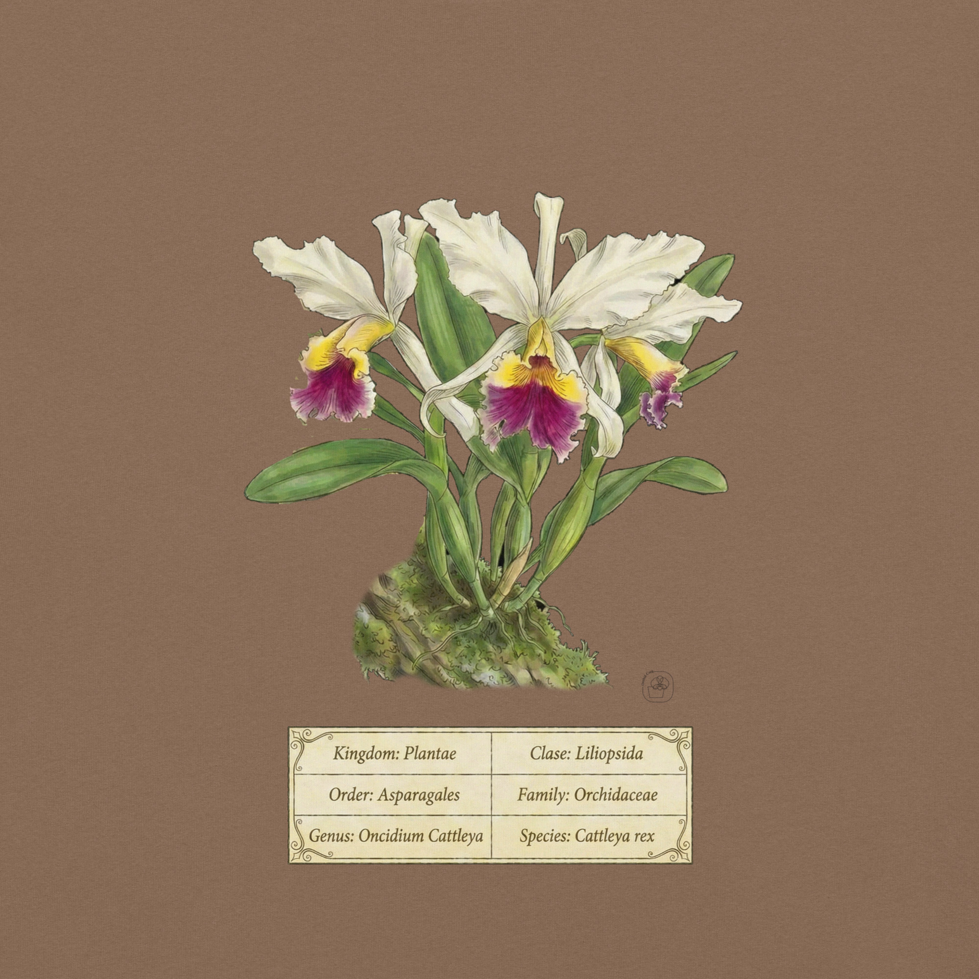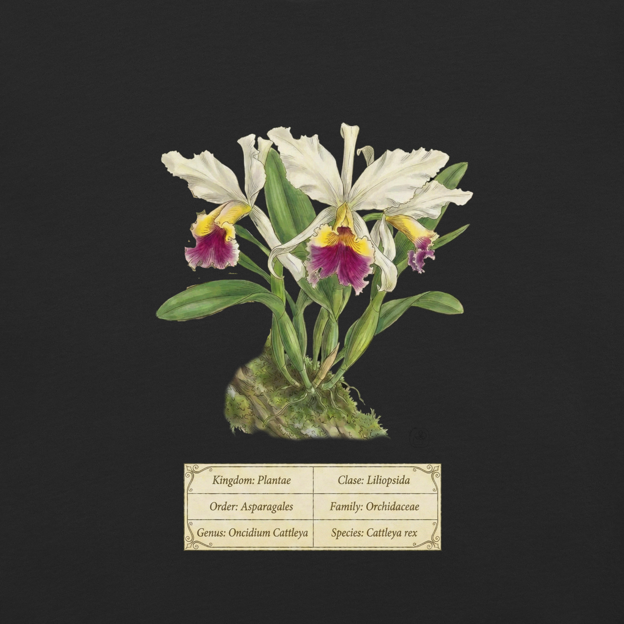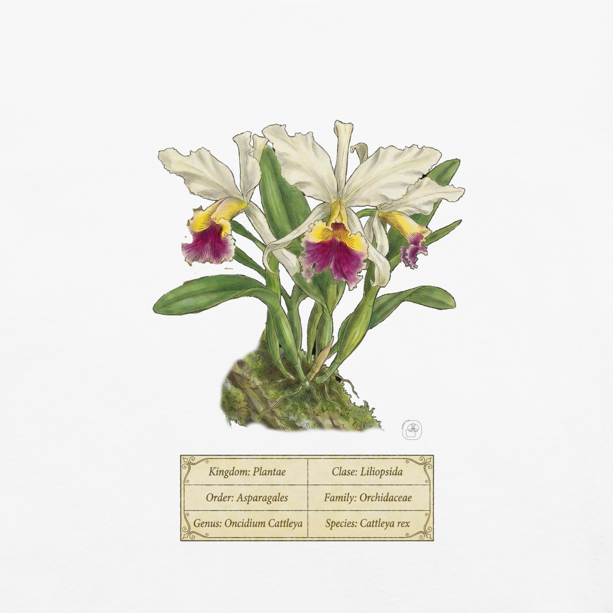 This t-shirt features a detailed illustration of Cattleya rex, inspired by 19th-century scientific botanical plates: clear compositions, precise linework, and a naturalistic aesthetic focused on the real structure of the plant.