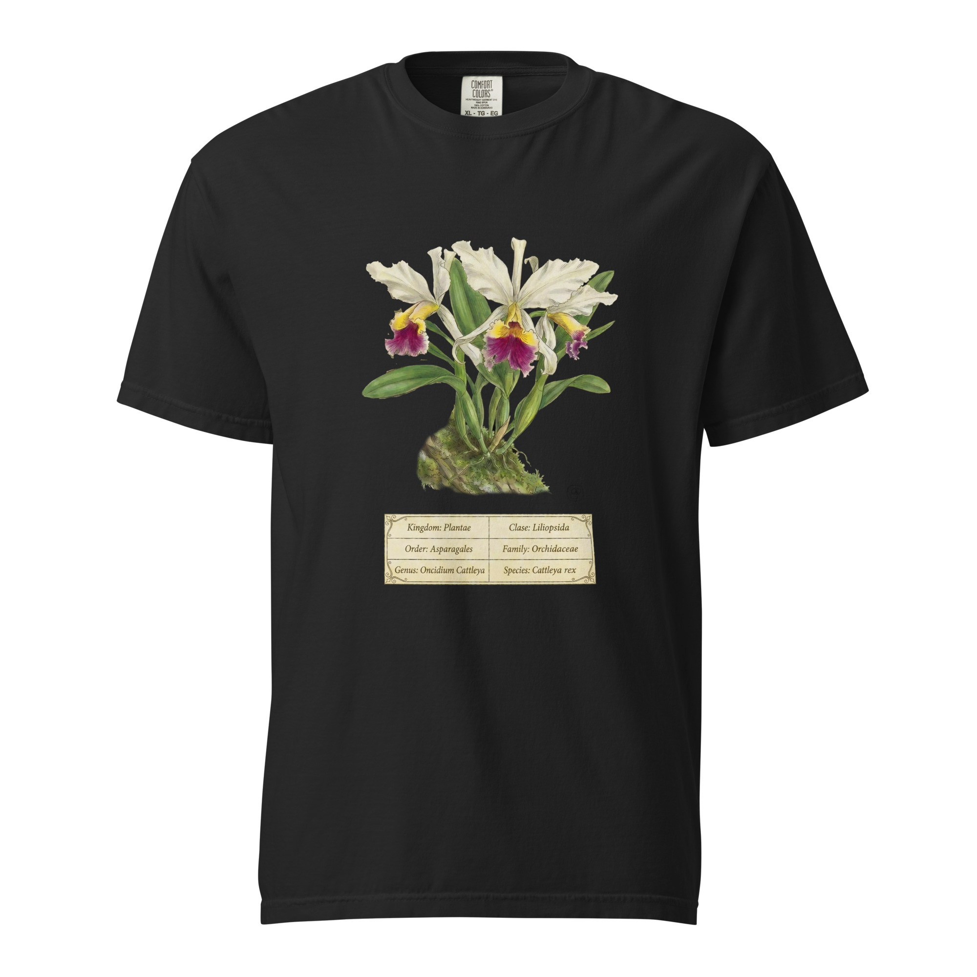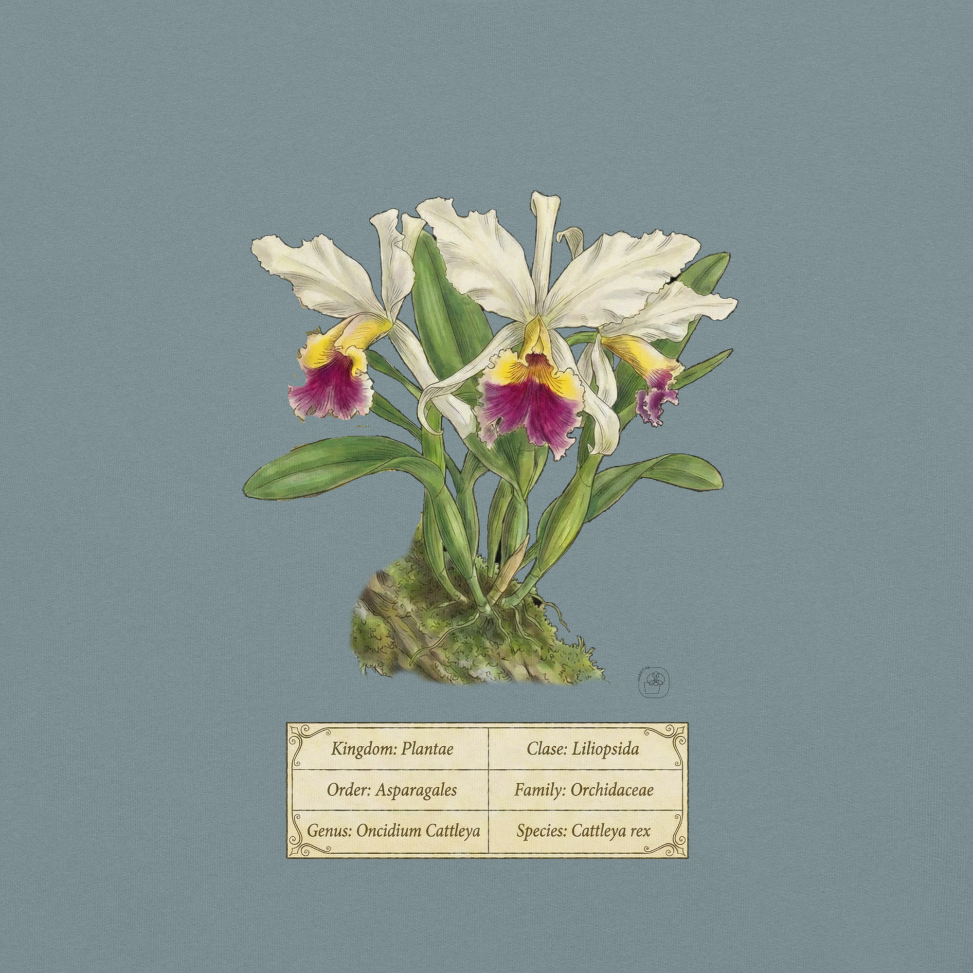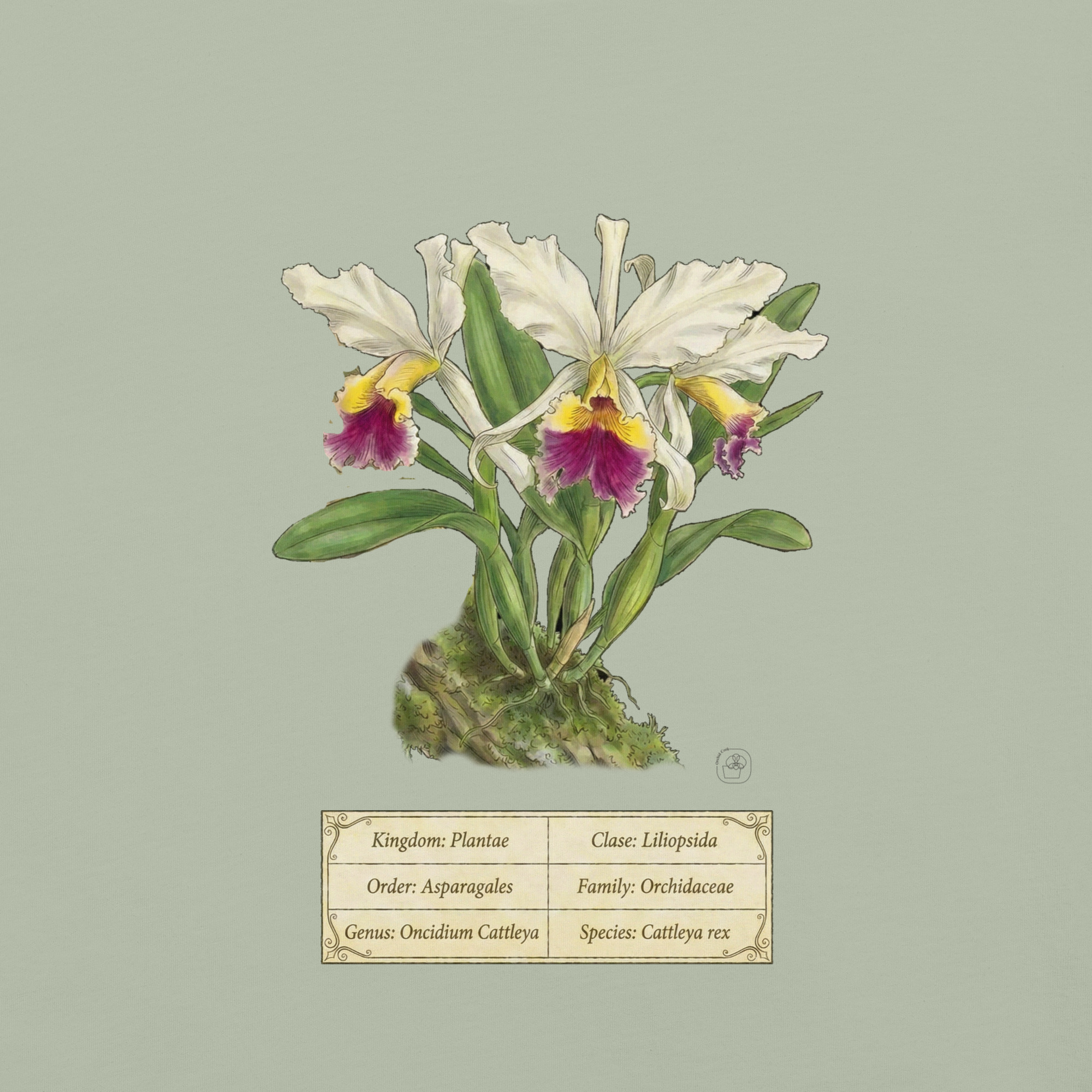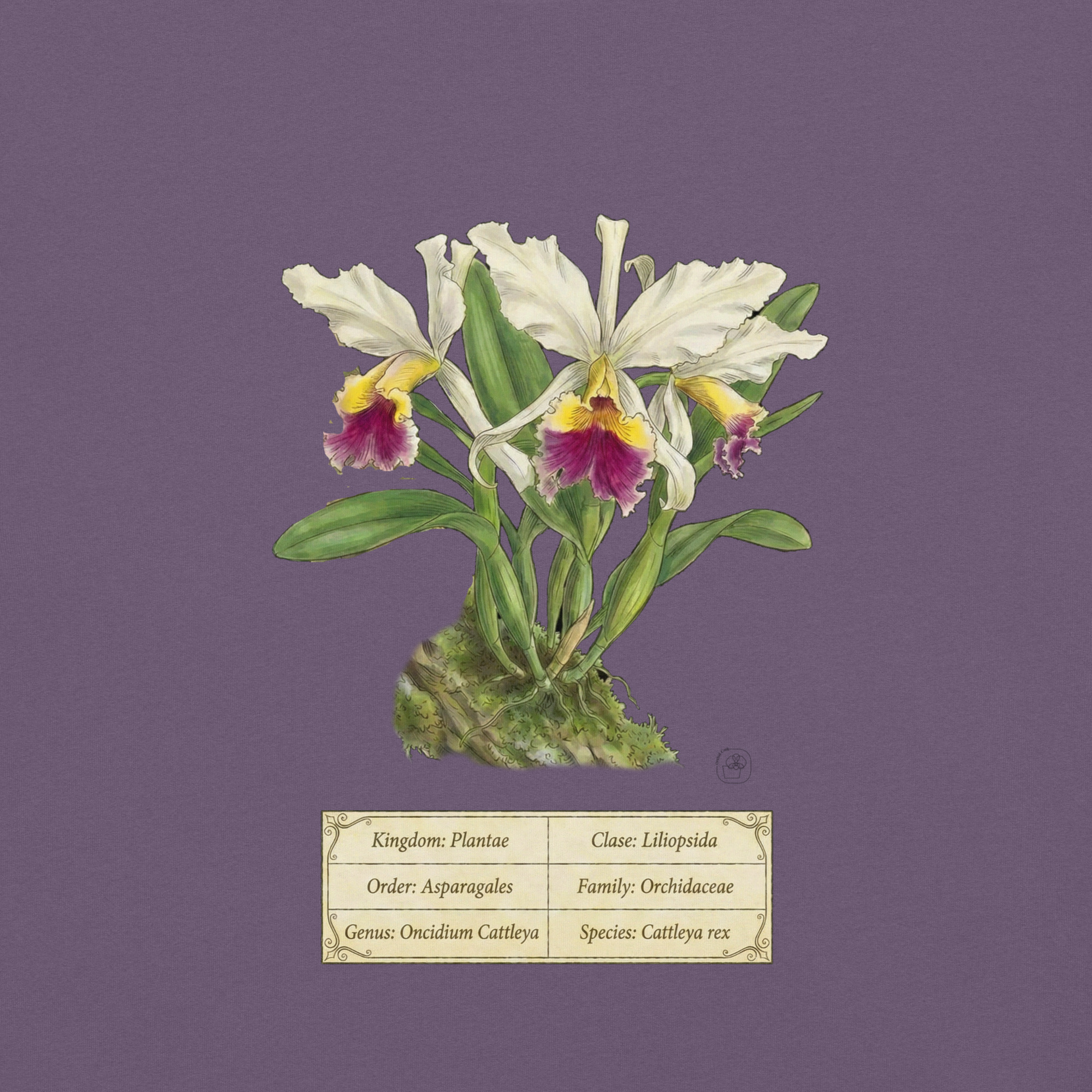 This t-shirt features a detailed illustration of Cattleya rex, inspired by 19th-century scientific botanical plates: clear compositions, precise linework, and a naturalistic aesthetic focused on the real structure of the plant.
