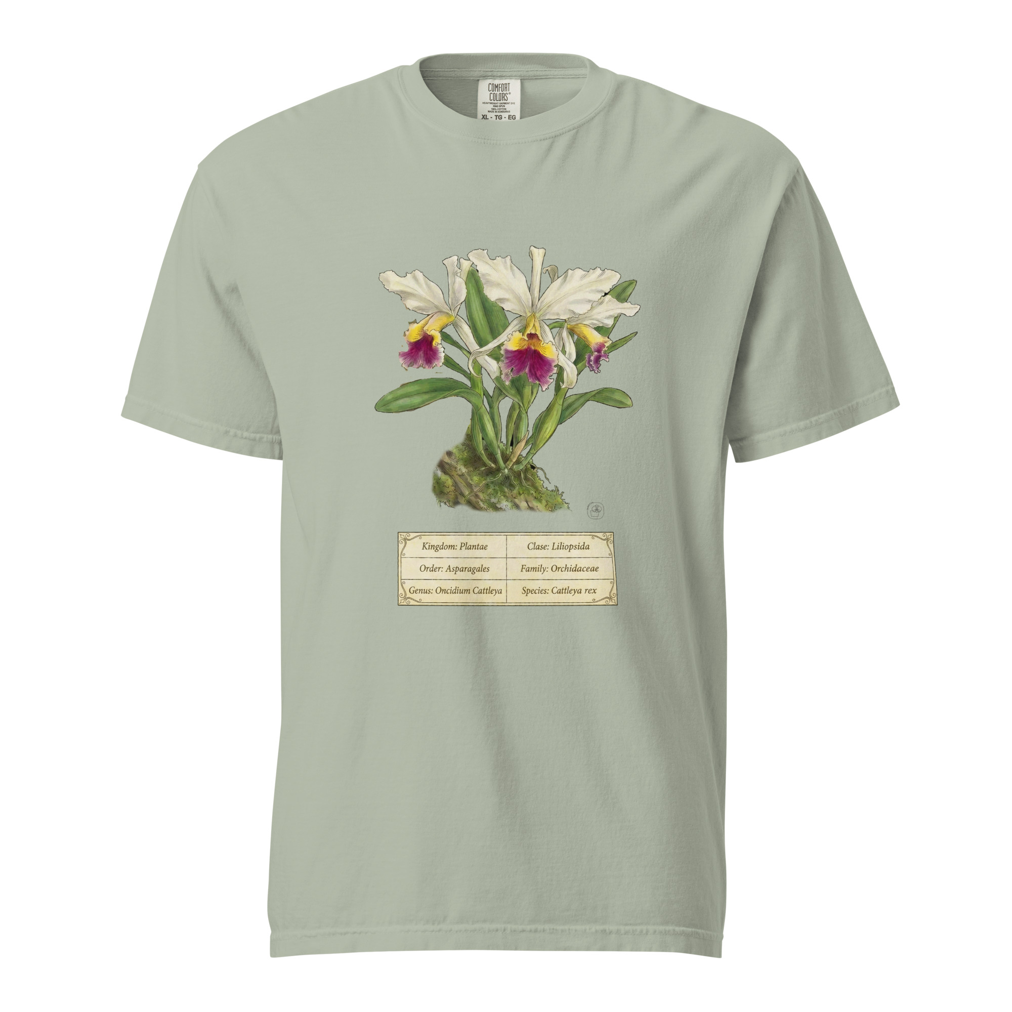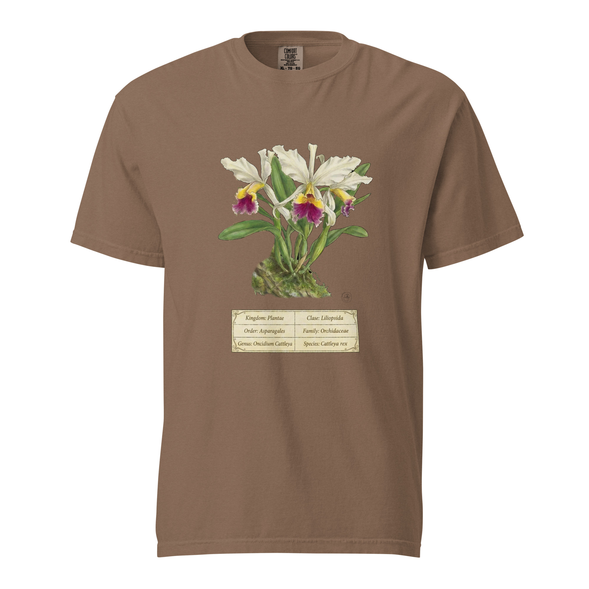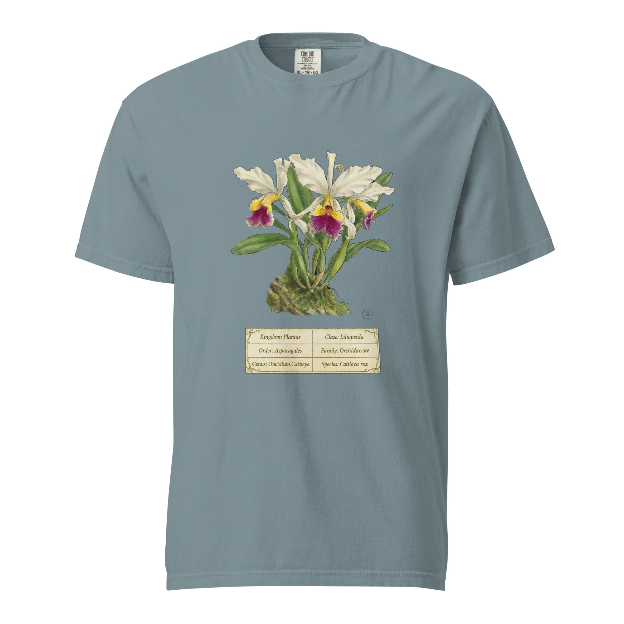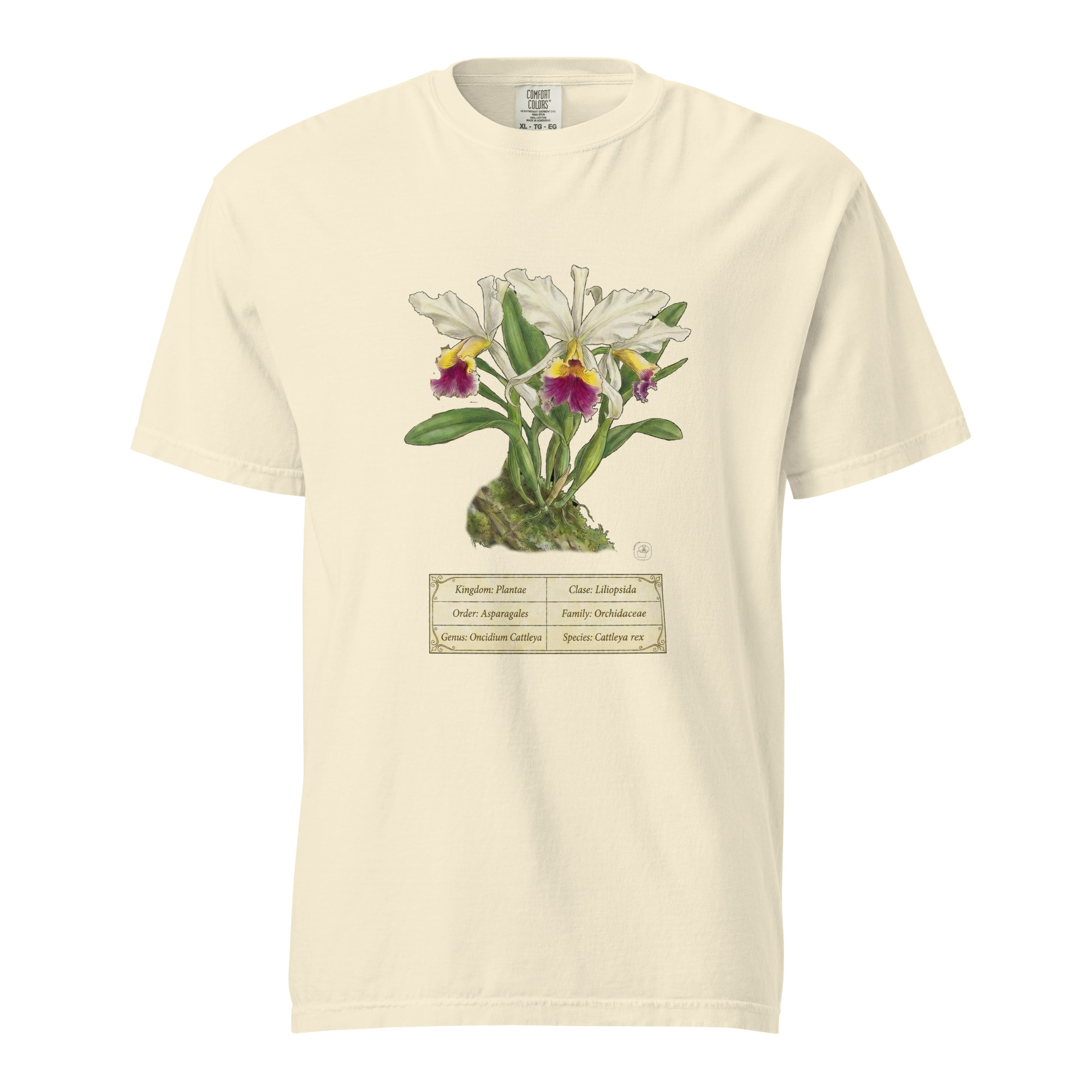 This t-shirt features a detailed illustration of Cattleya rex, inspired by 19th-century scientific botanical plates: clear compositions, precise linework, and a naturalistic aesthetic focused on the real structure of the plant.