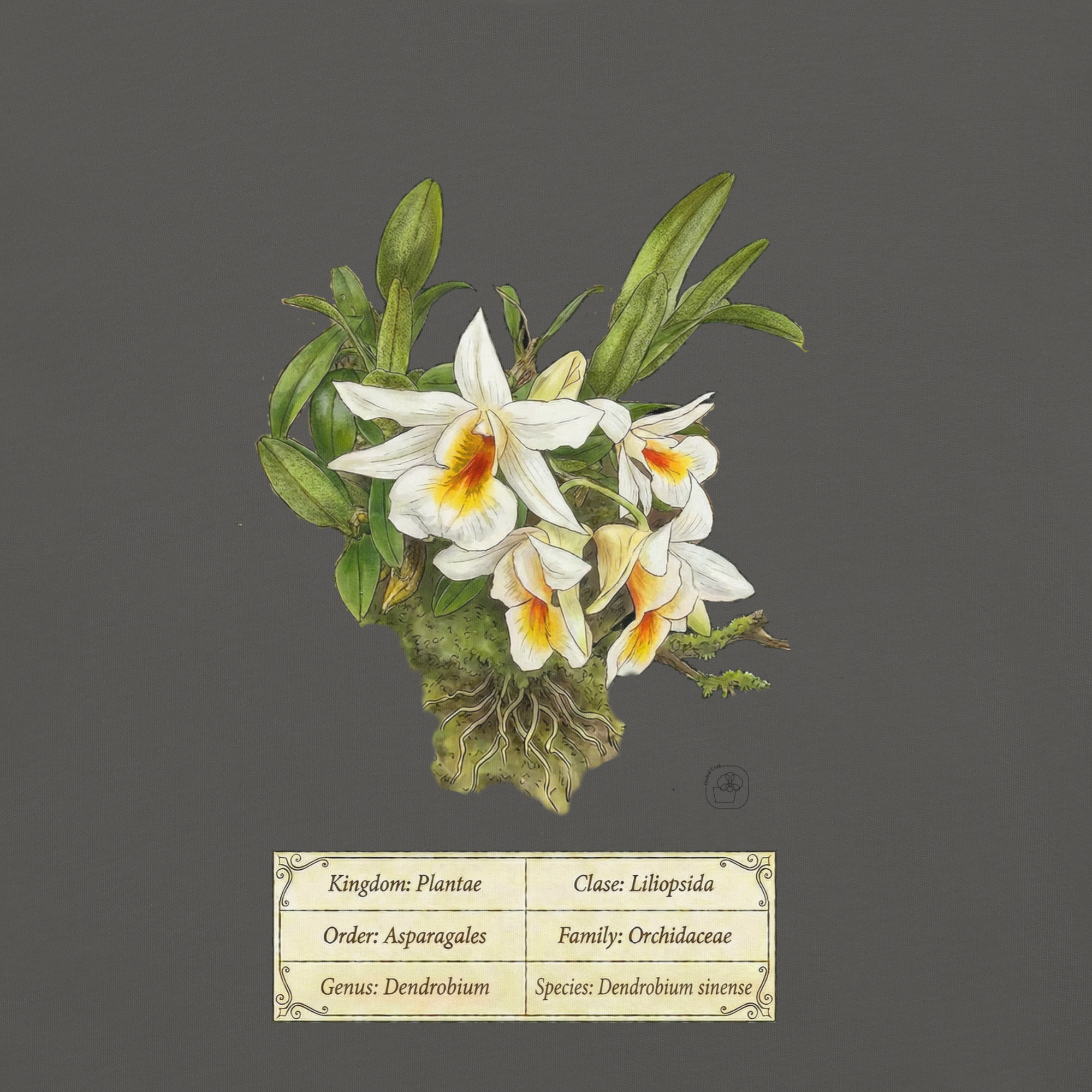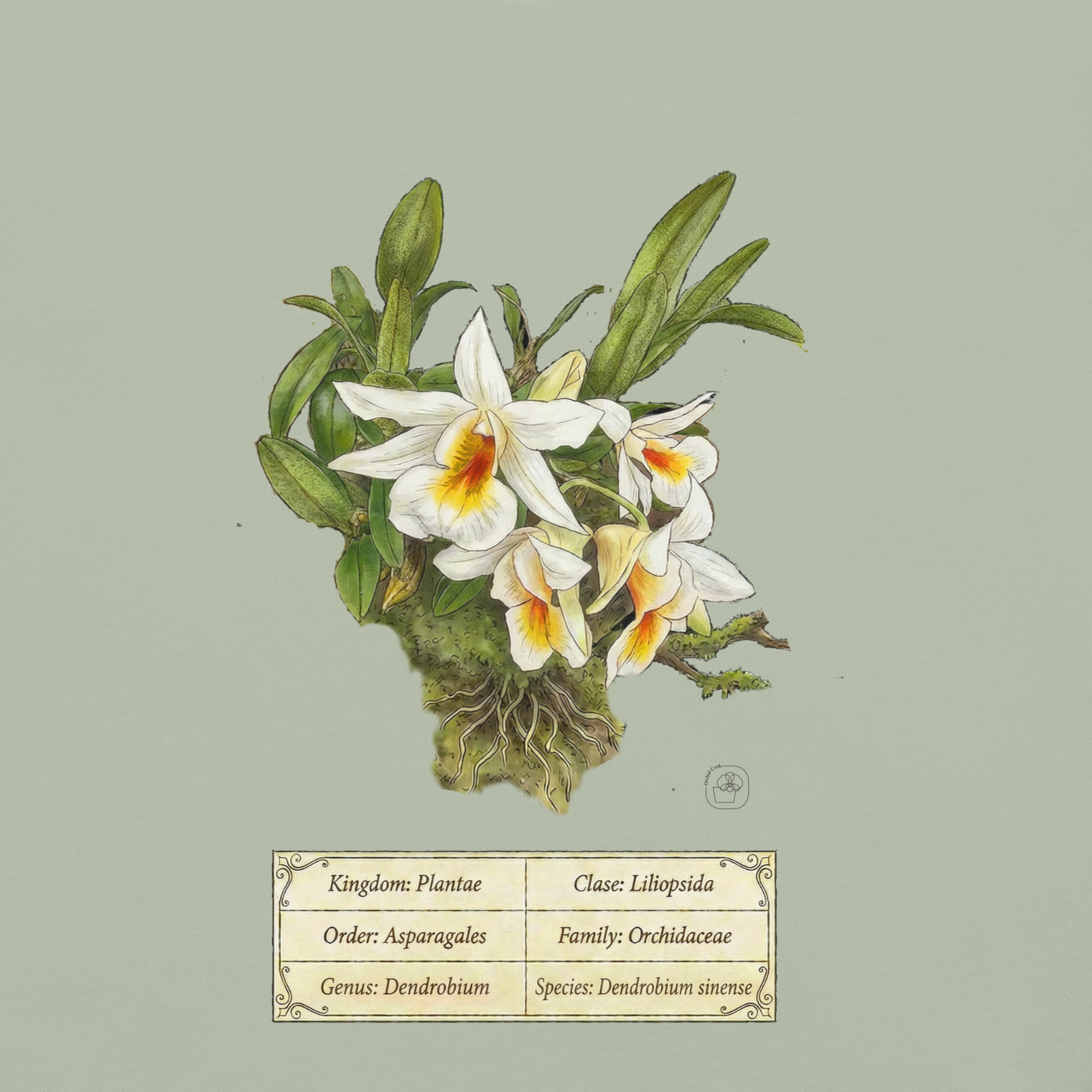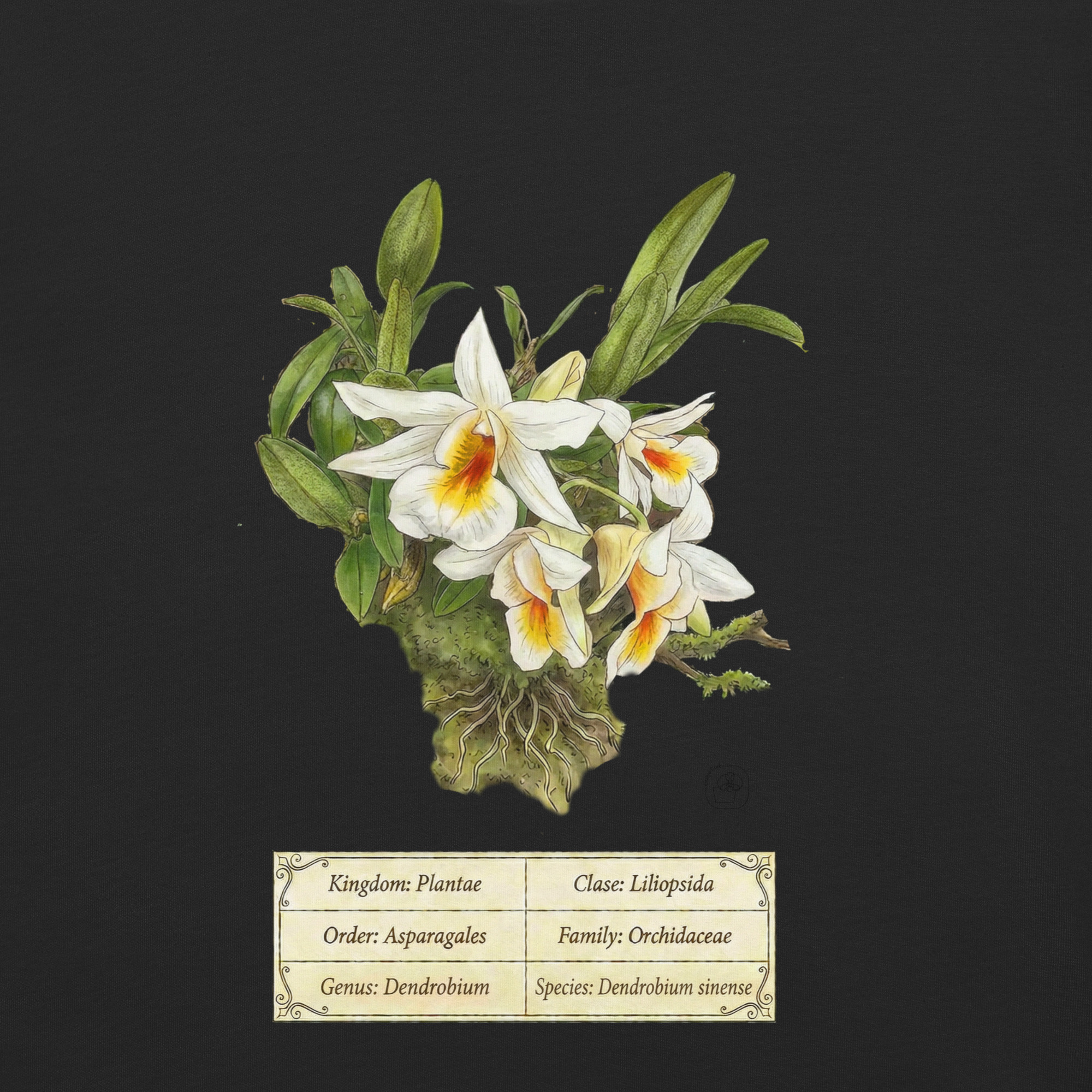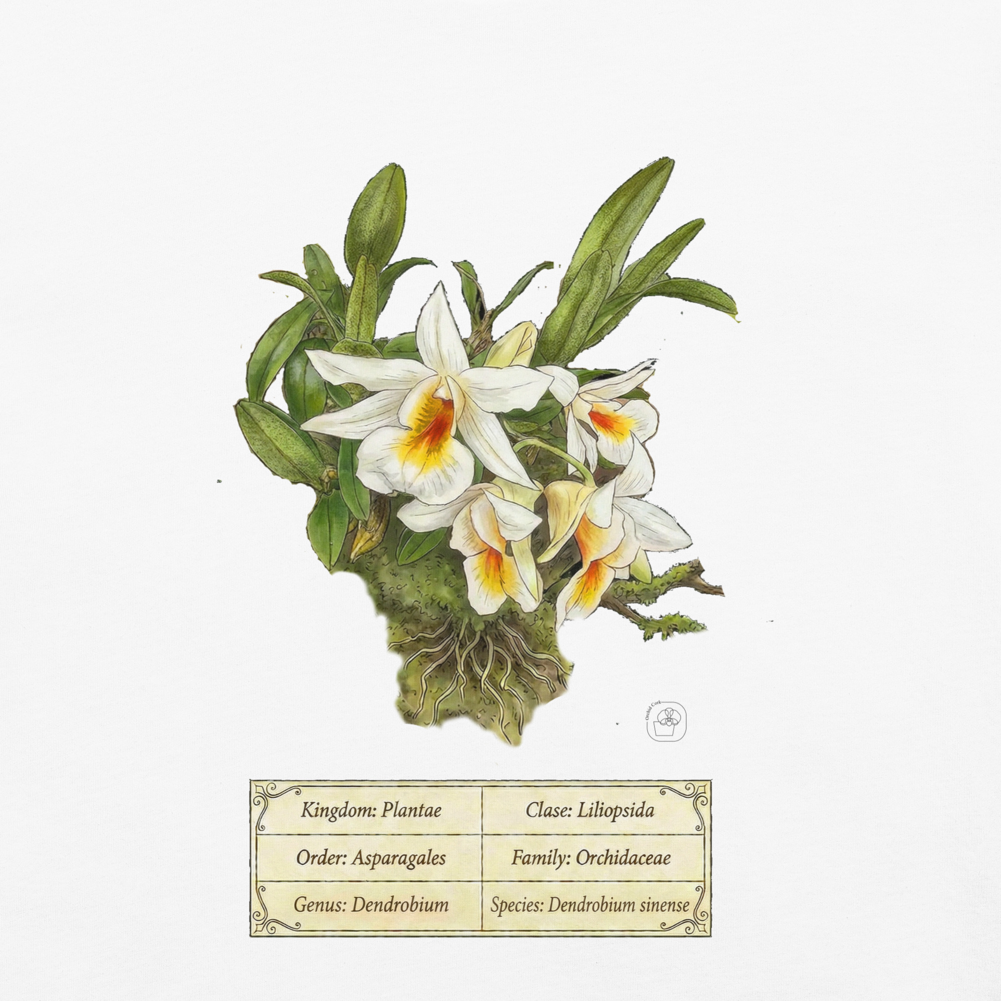 This t-shirt features a detailed illustration of Dendrobium sinense, inspired by 19th-century scientific botanical plates: clear compositions, precise linework, and a naturalistic aesthetic focused on the real structure of the plant.