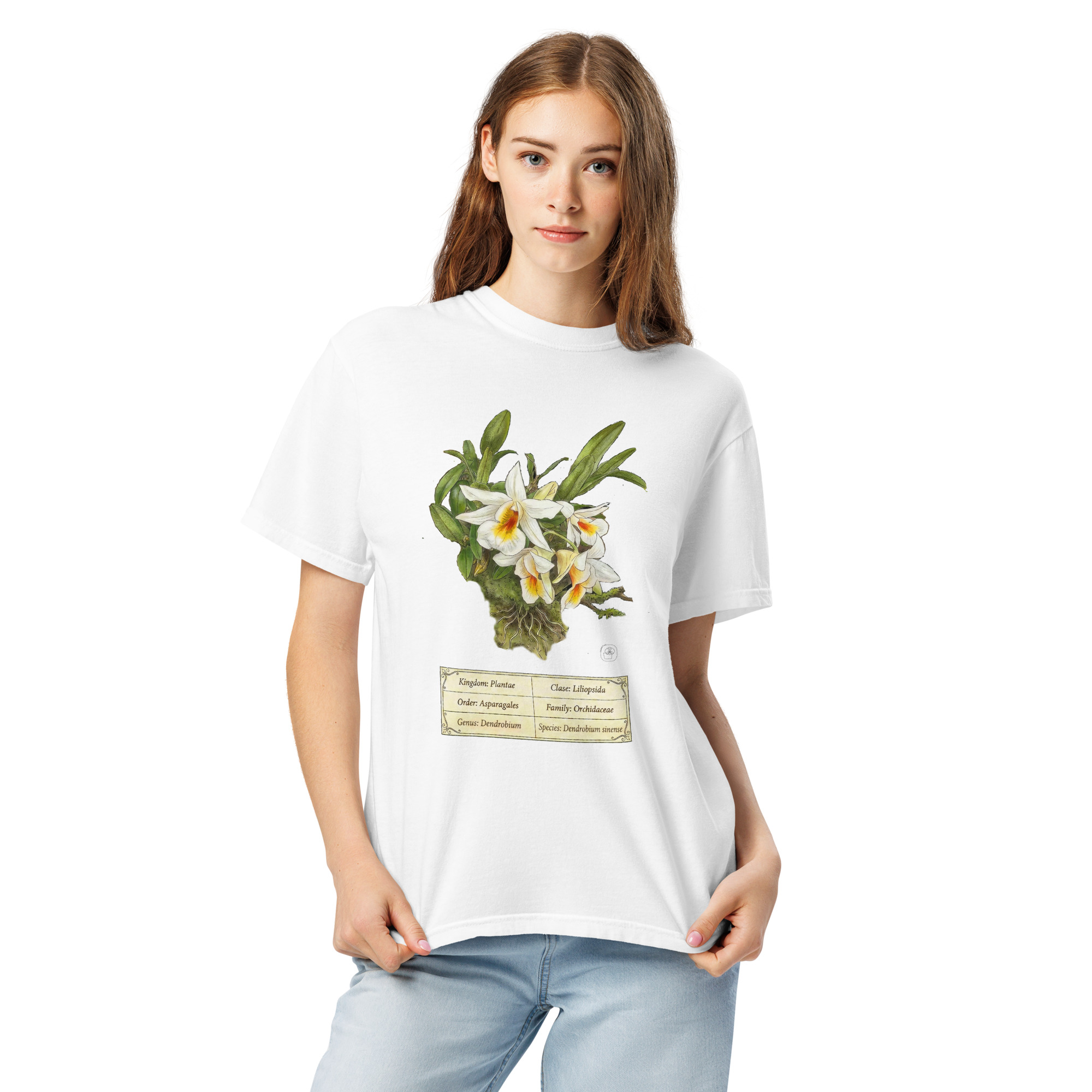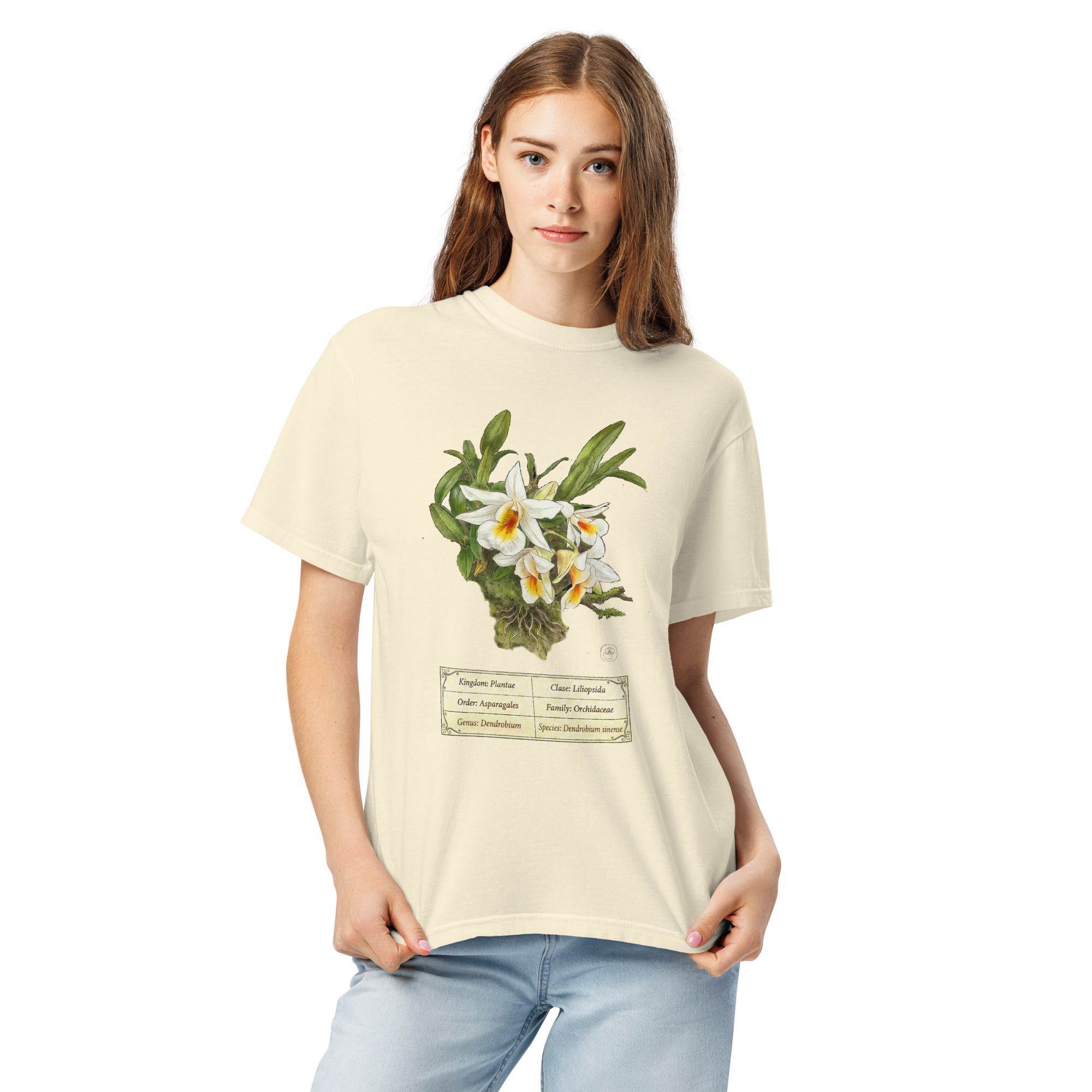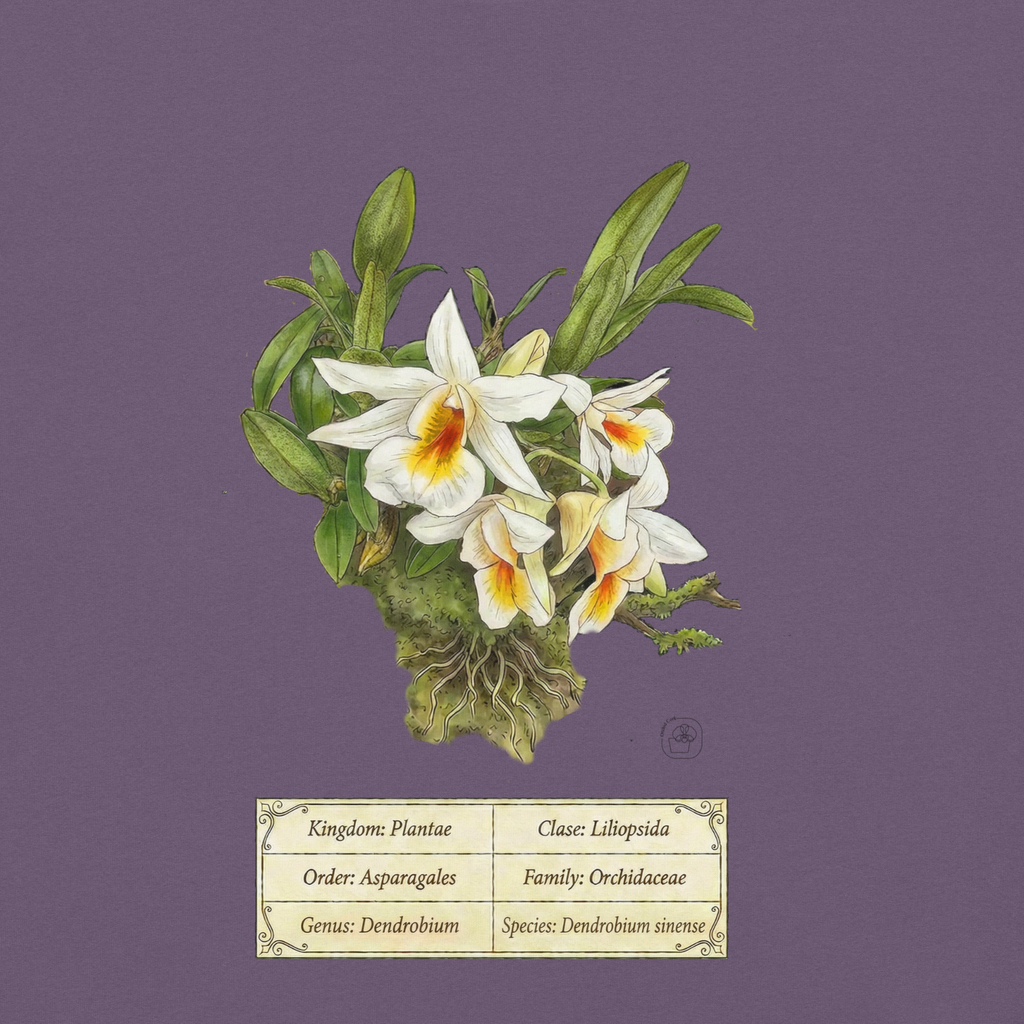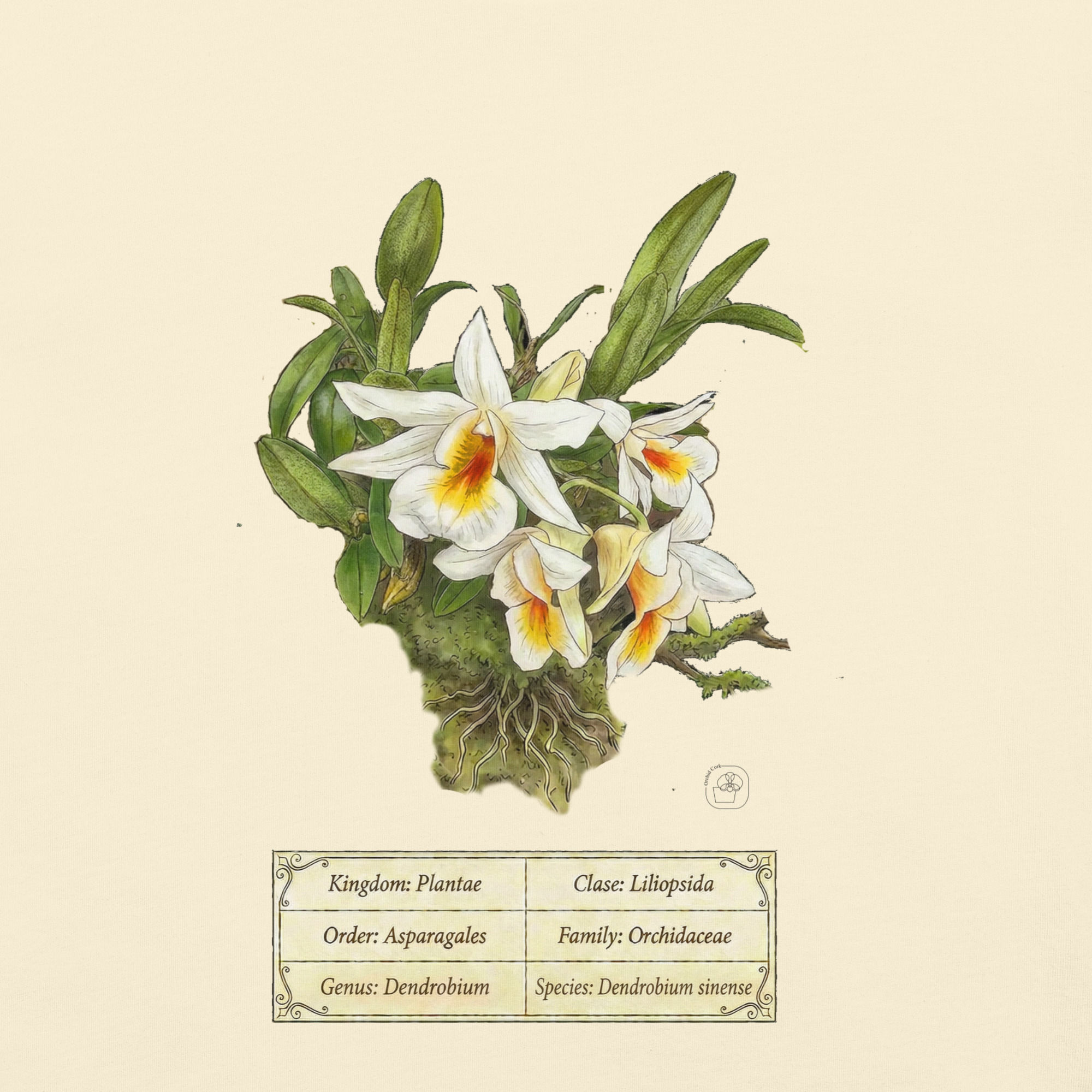 This t-shirt features a detailed illustration of Dendrobium sinense, inspired by 19th-century scientific botanical plates: clear compositions, precise linework, and a naturalistic aesthetic focused on the real structure of the plant.