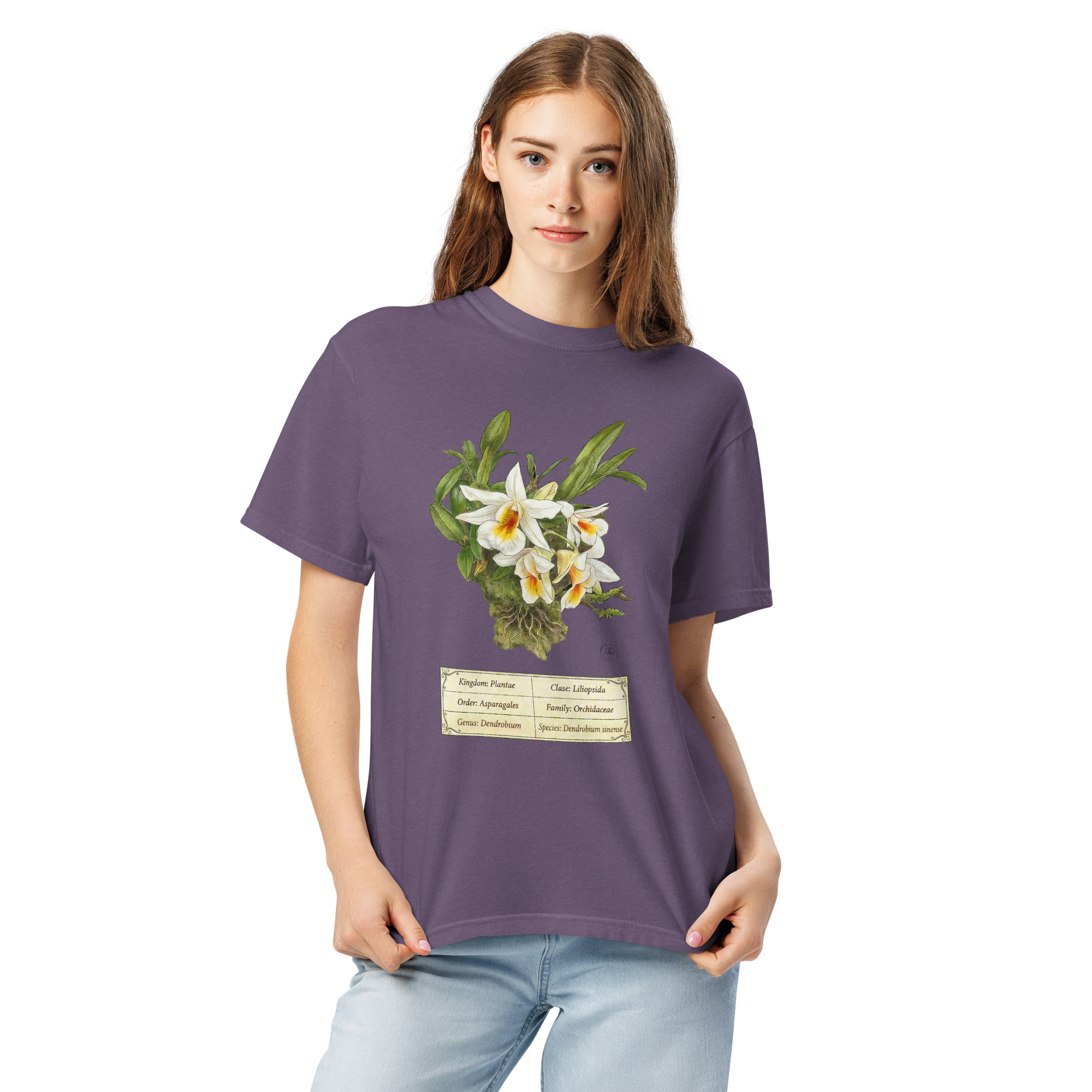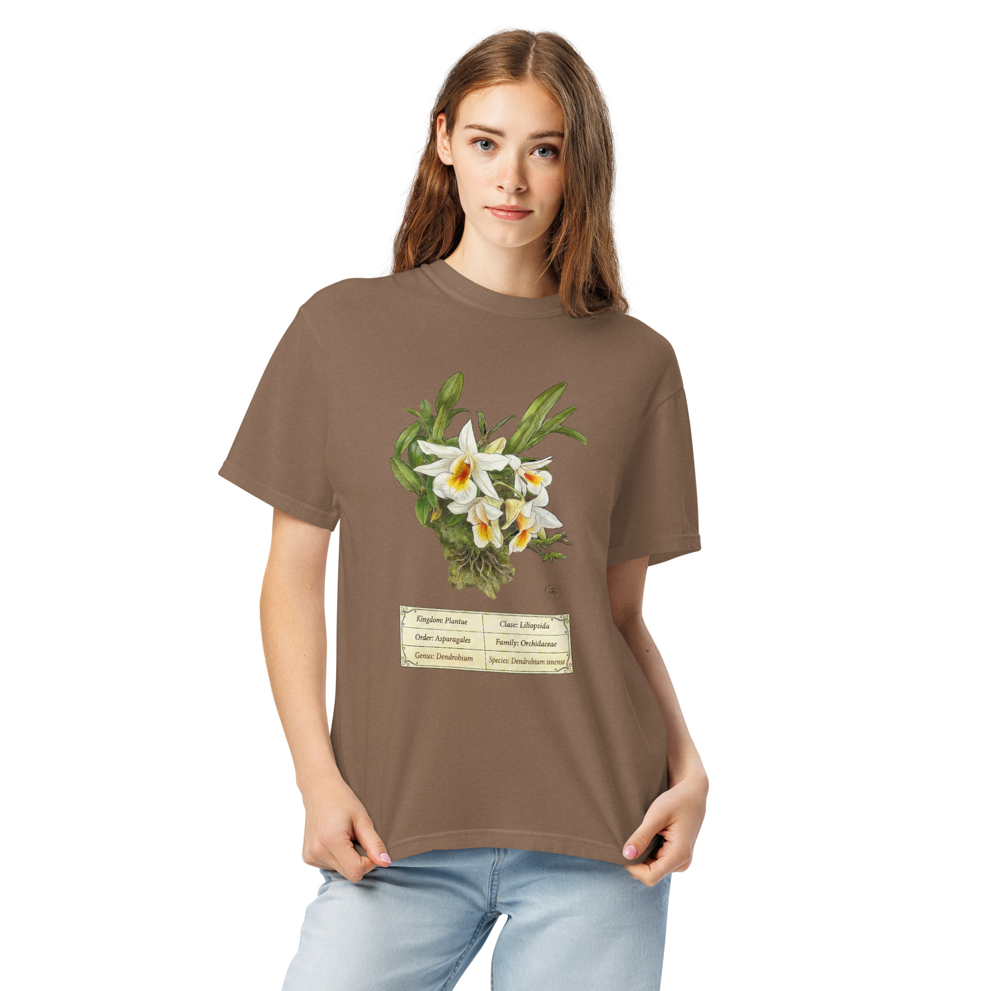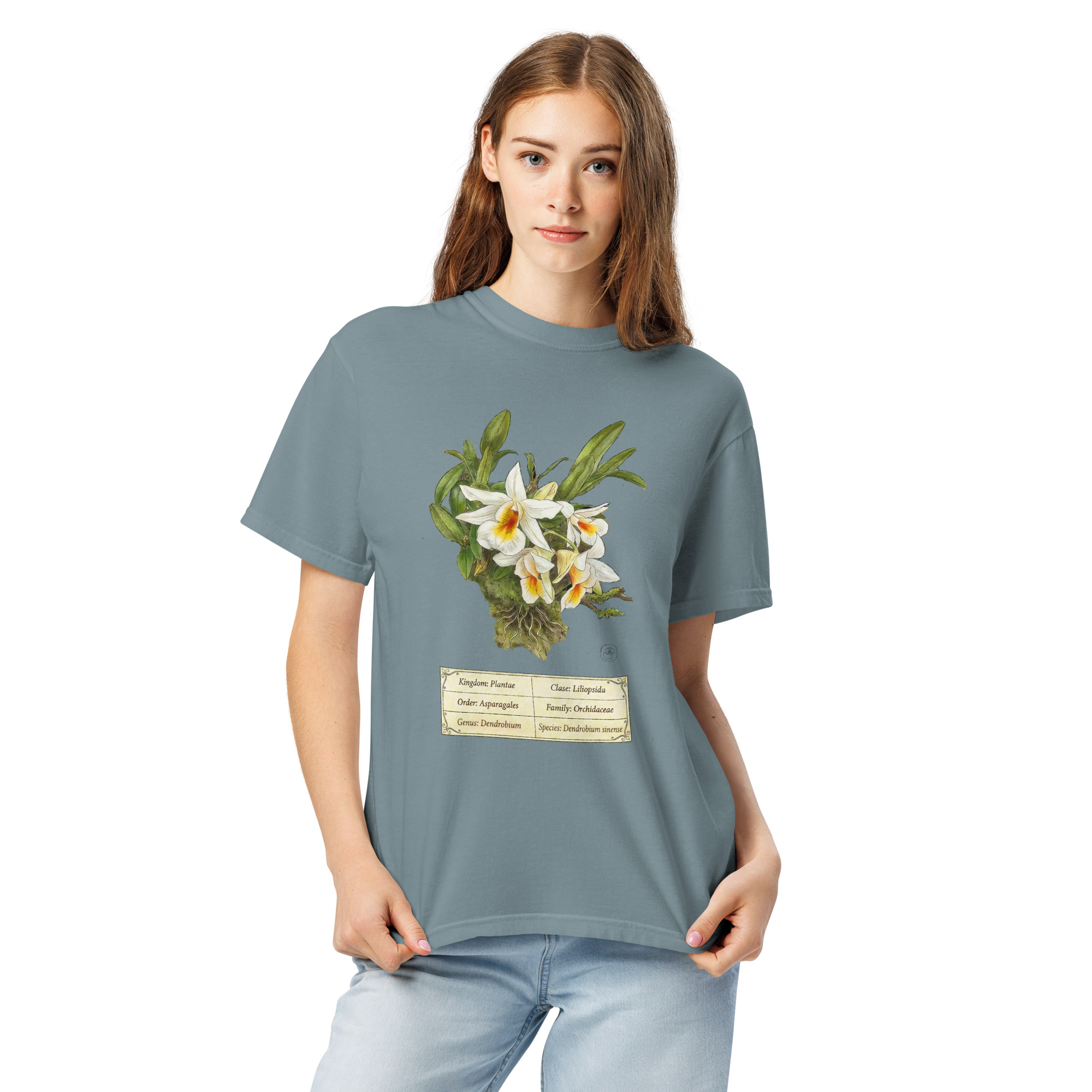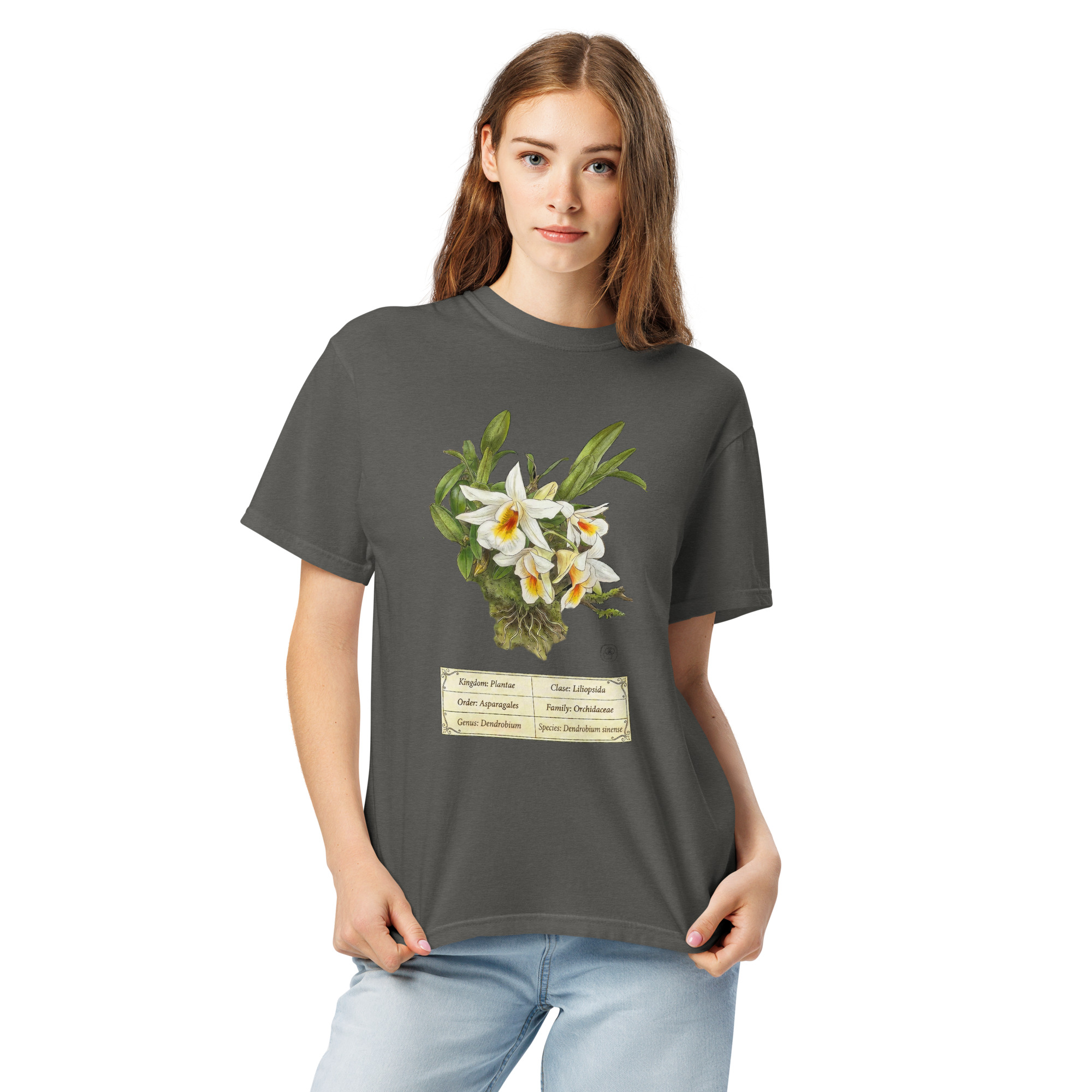 This t-shirt features a detailed illustration of Dendrobium sinense, inspired by 19th-century scientific botanical plates: clear compositions, precise linework, and a naturalistic aesthetic focused on the real structure of the plant.