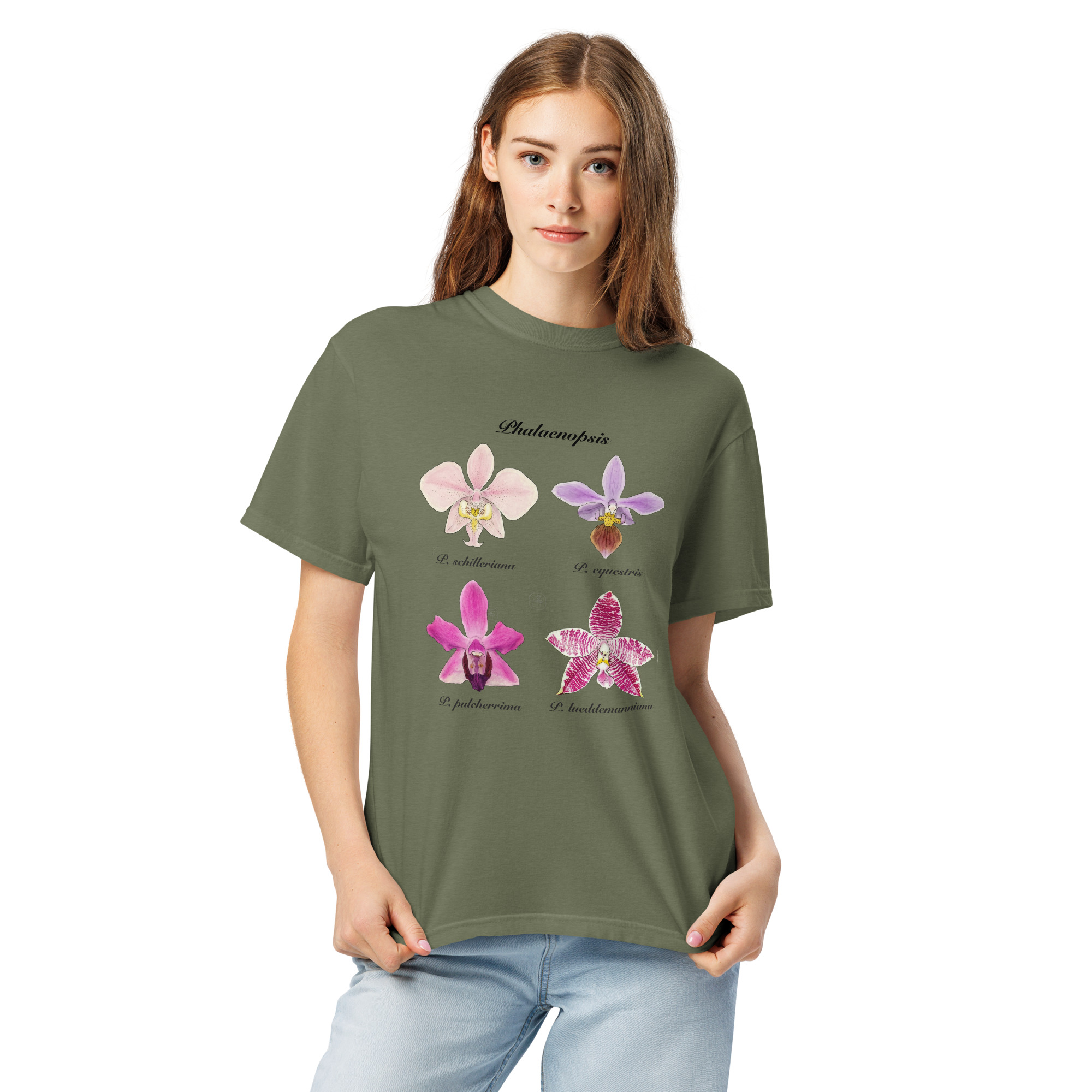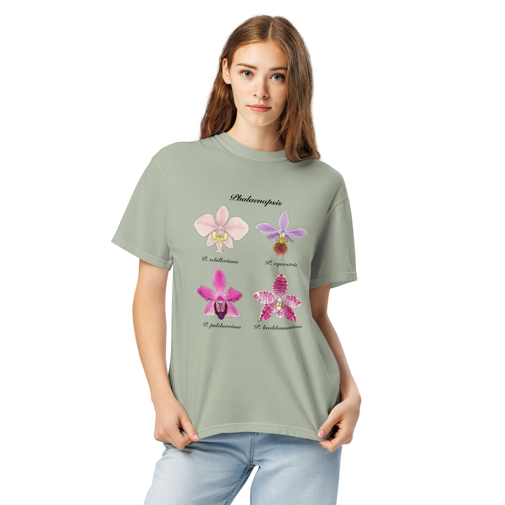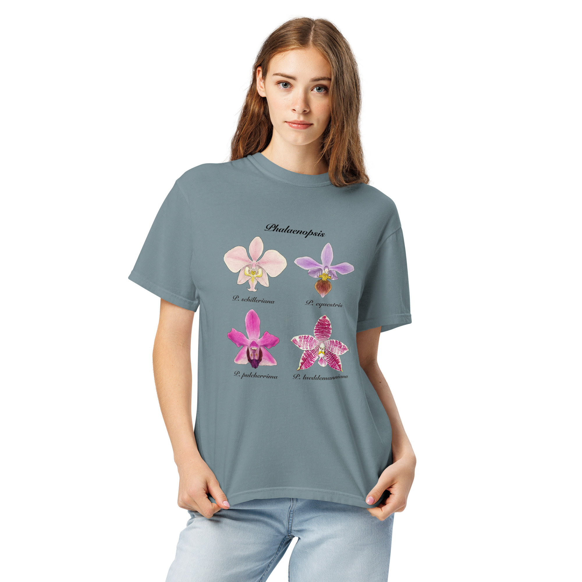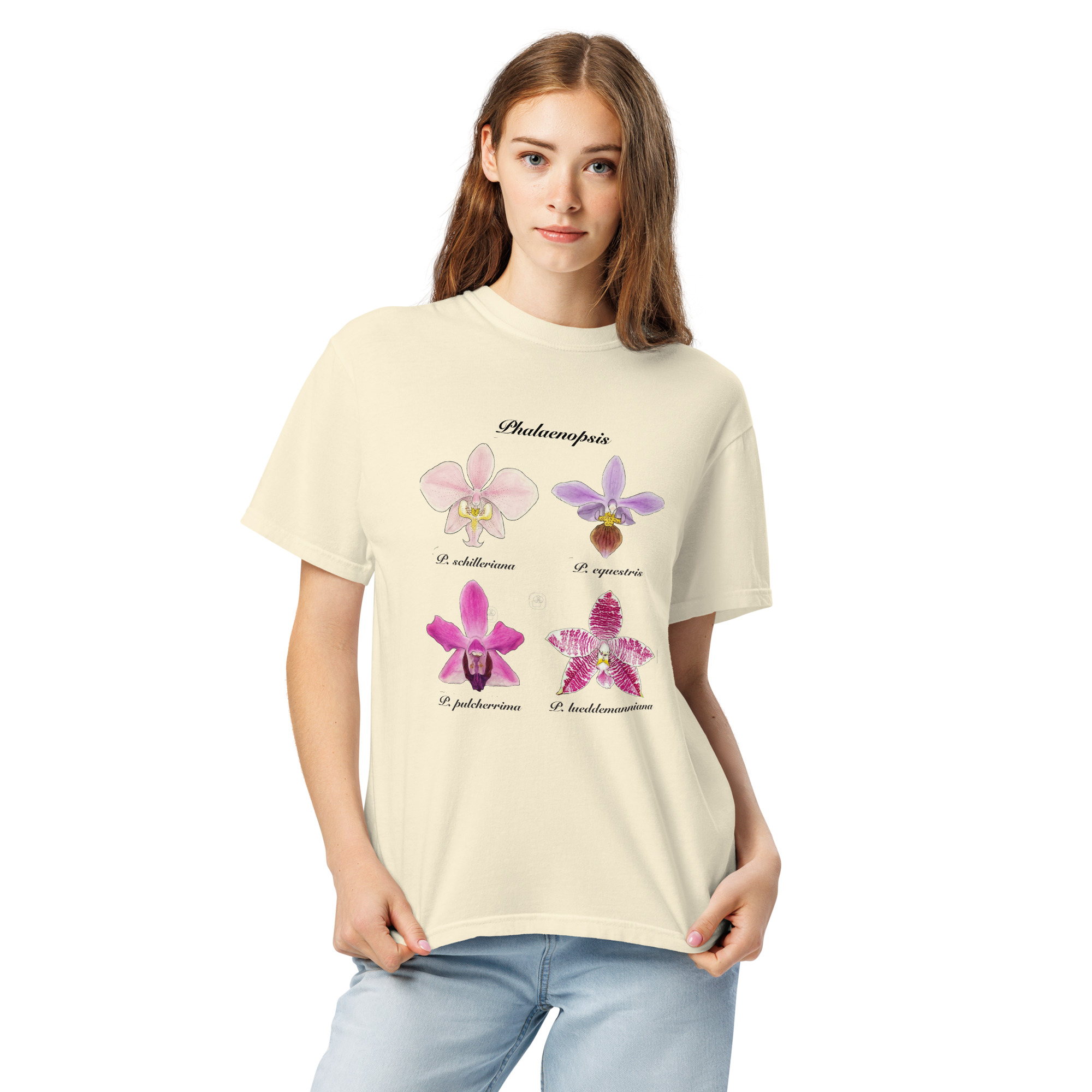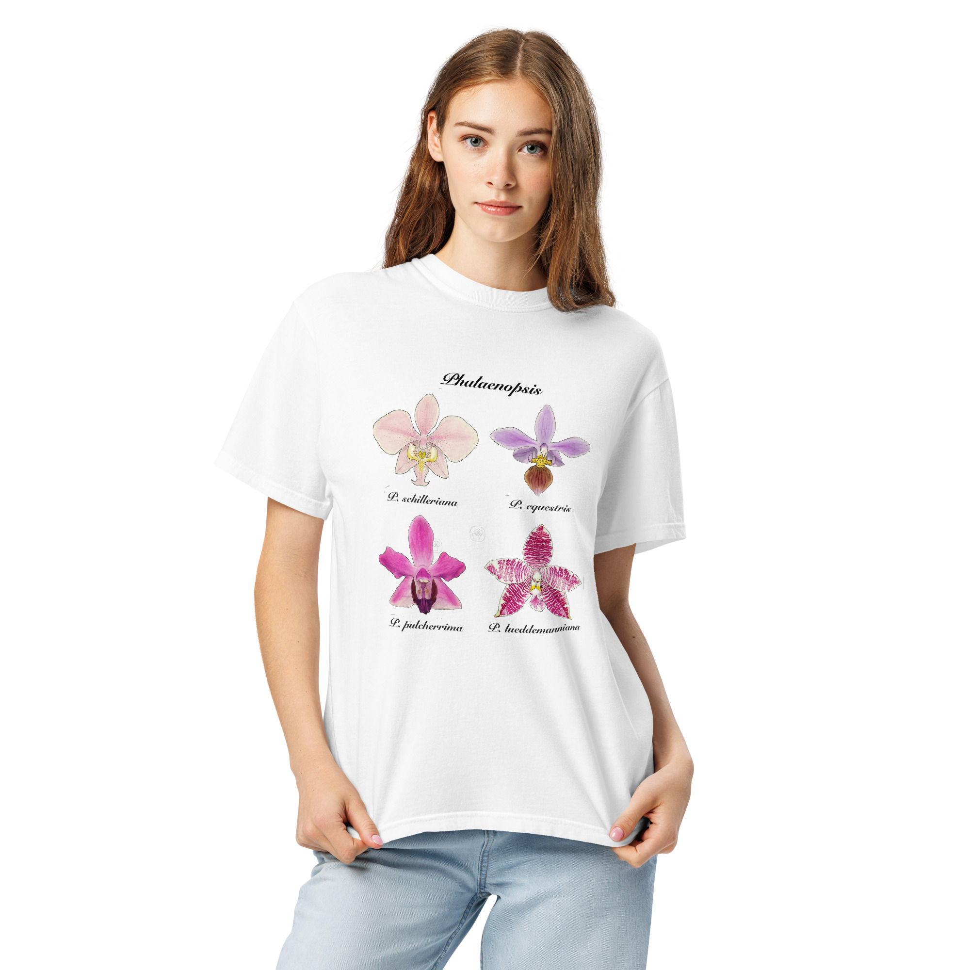 This t-shirt features a detailed illustration of Paphiopedilum spp, inspired by 19th-century scientific botanical plates: clear compositions, precise linework, and a naturalistic aesthetic focused on the real structure of the plant.