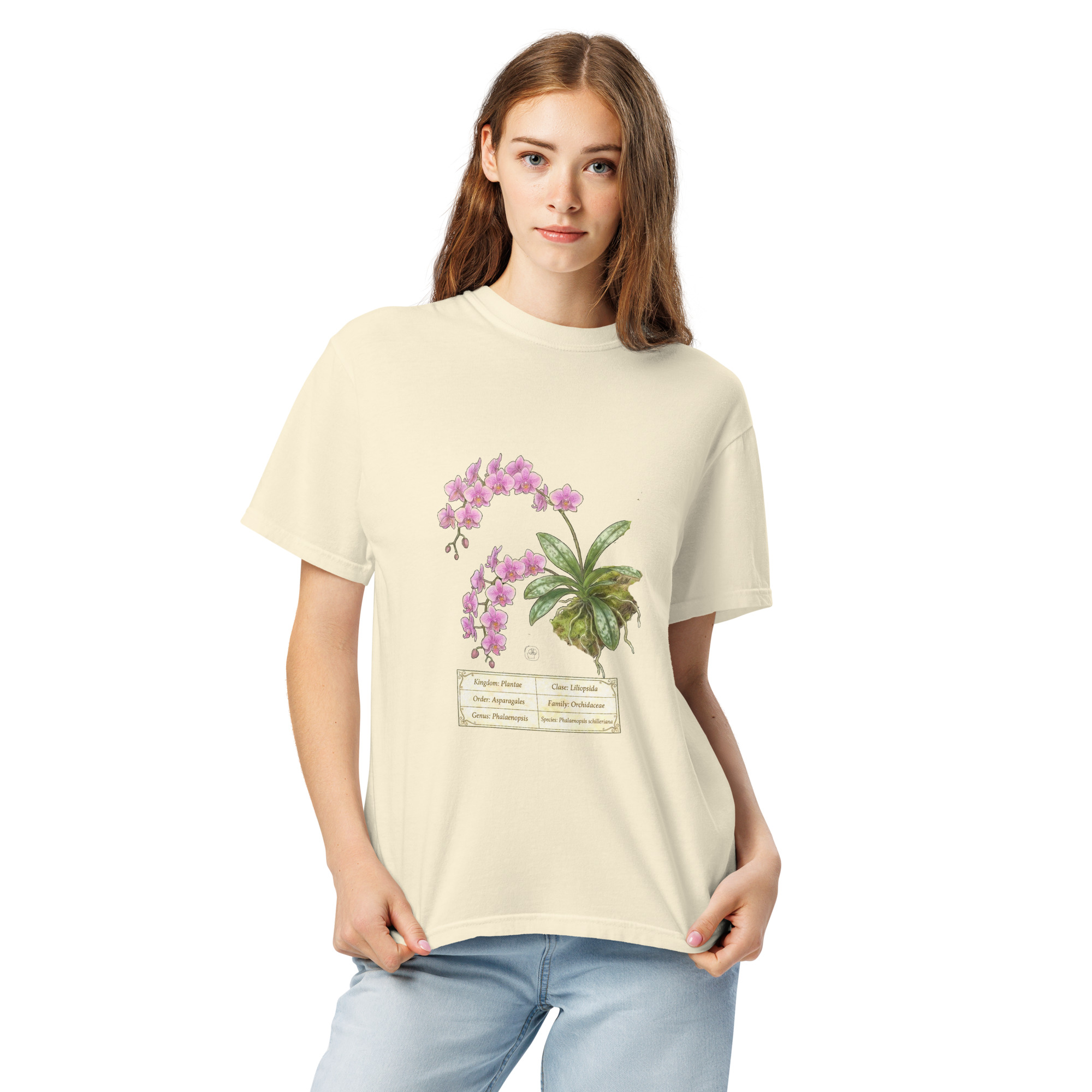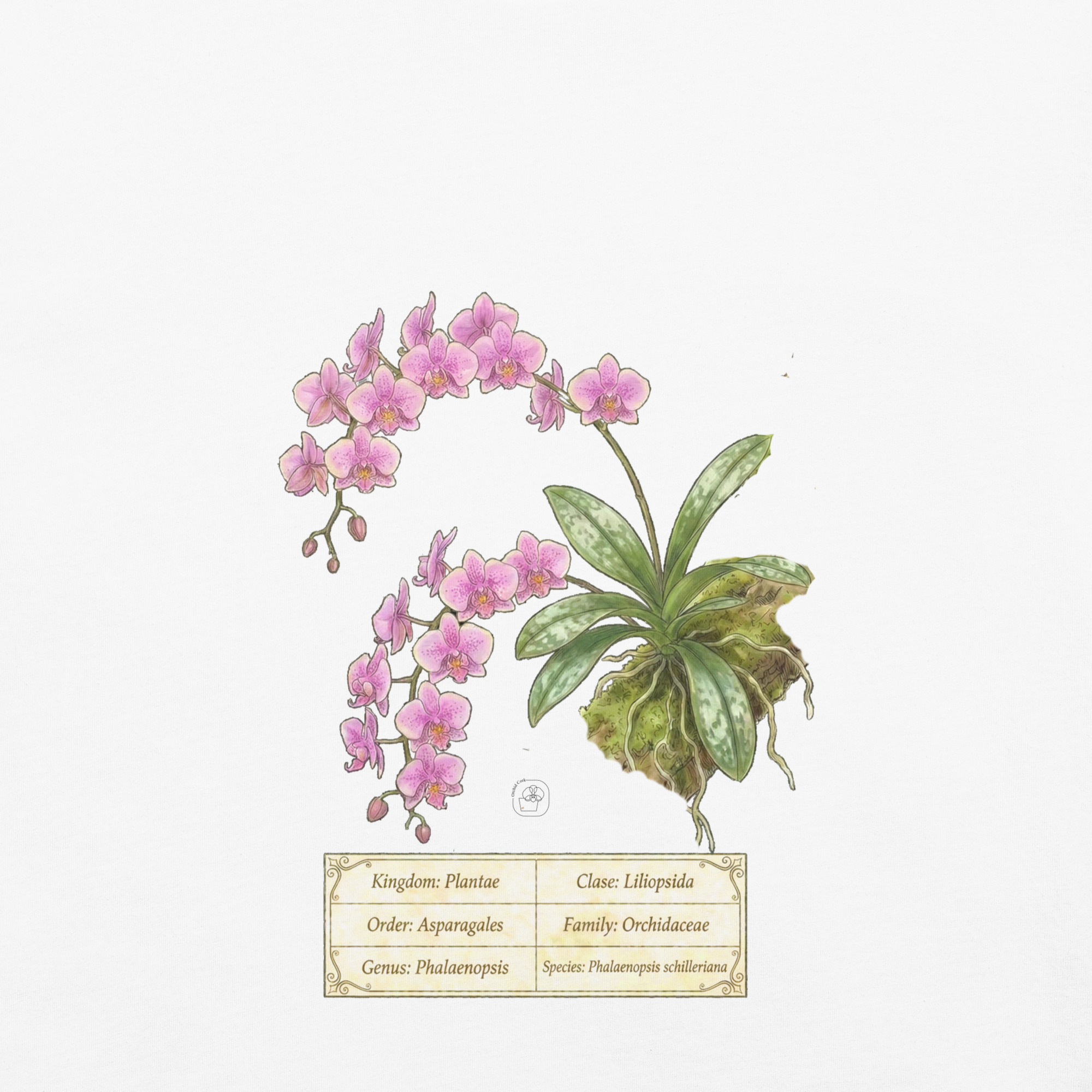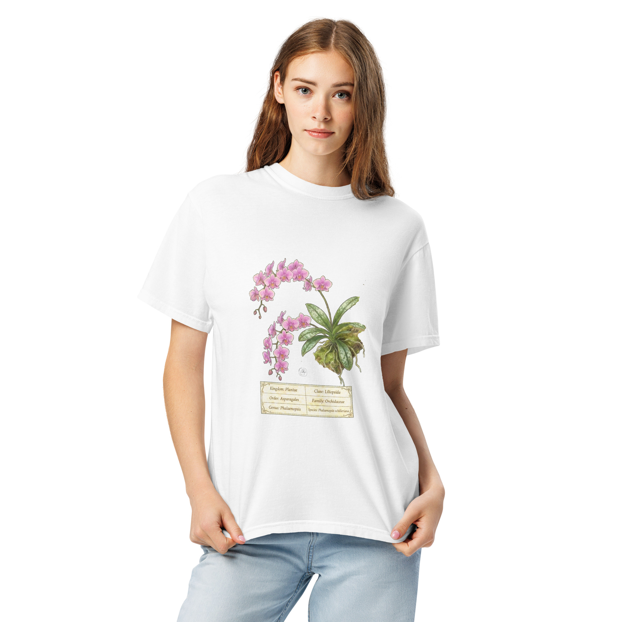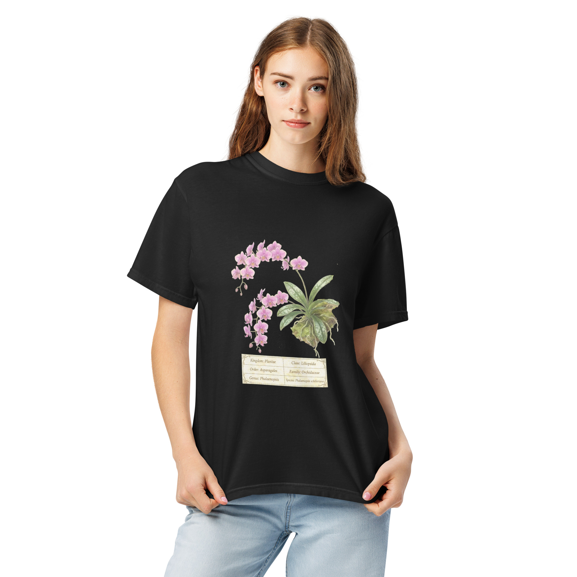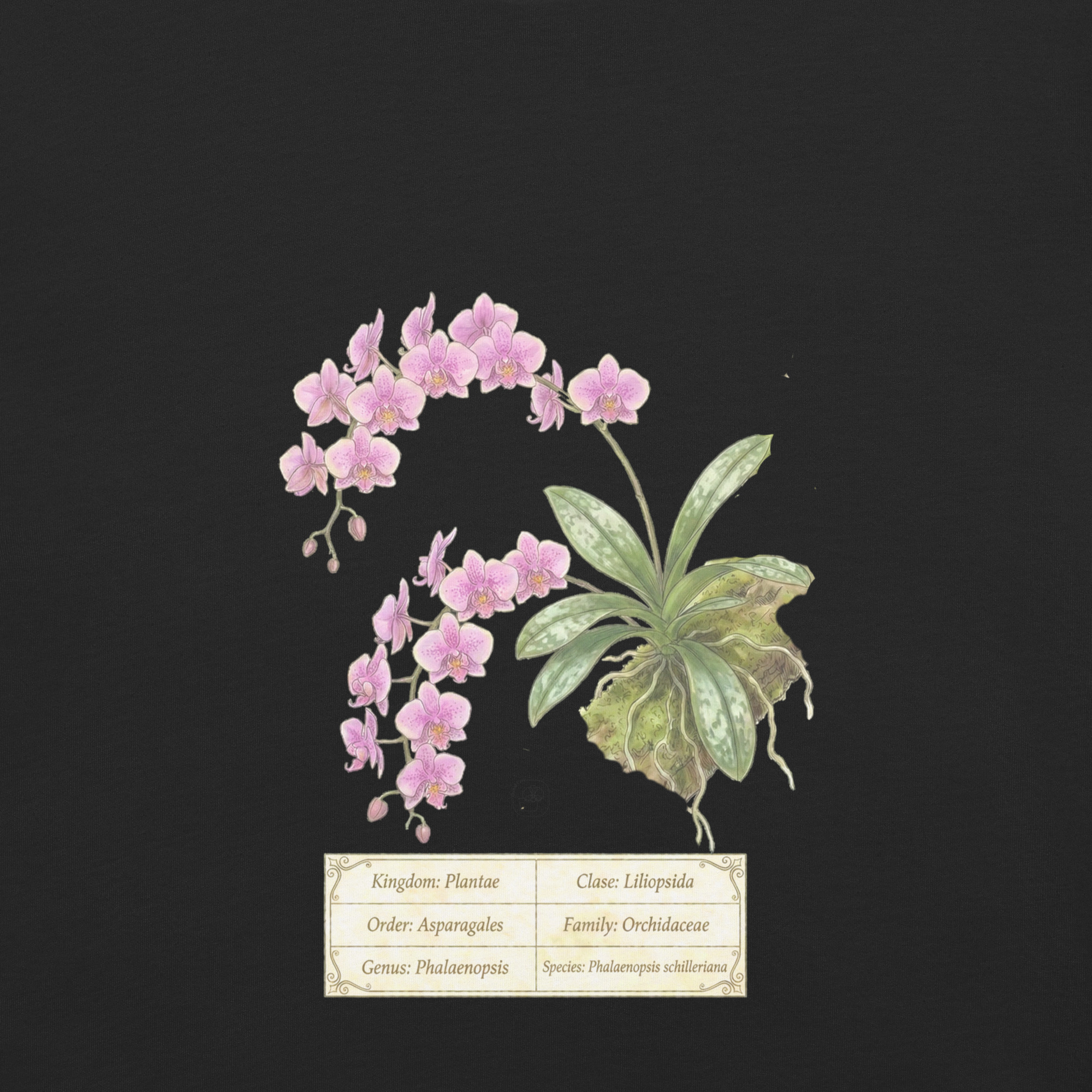 This t-shirt features a detailed illustration of Phalaenopsis schilleriana, inspired by 19th-century scientific botanical plates: clear compositions, precise linework, and a naturalistic aesthetic focused on the real structure of the plant.