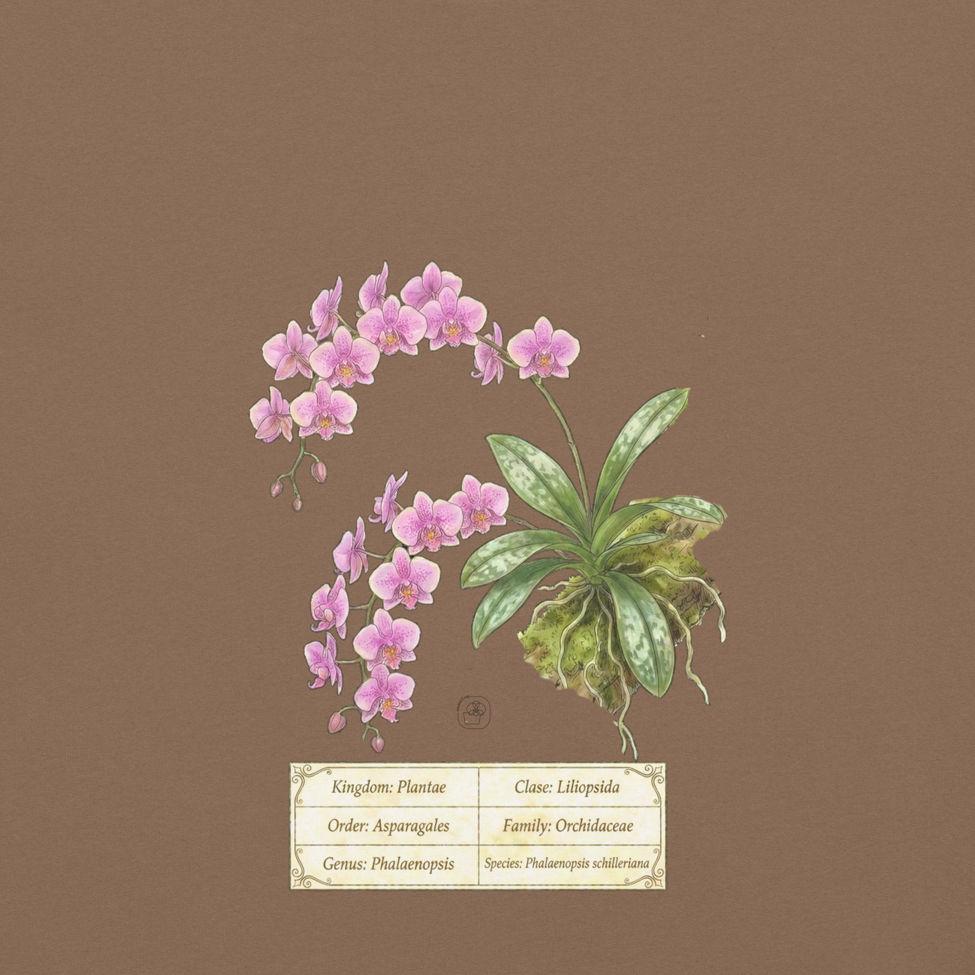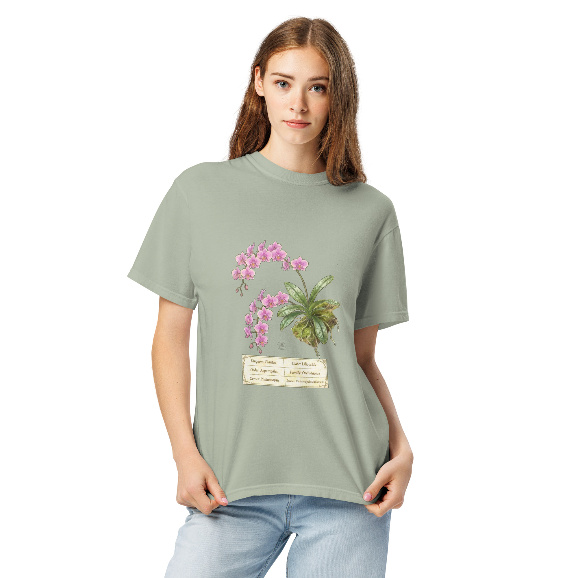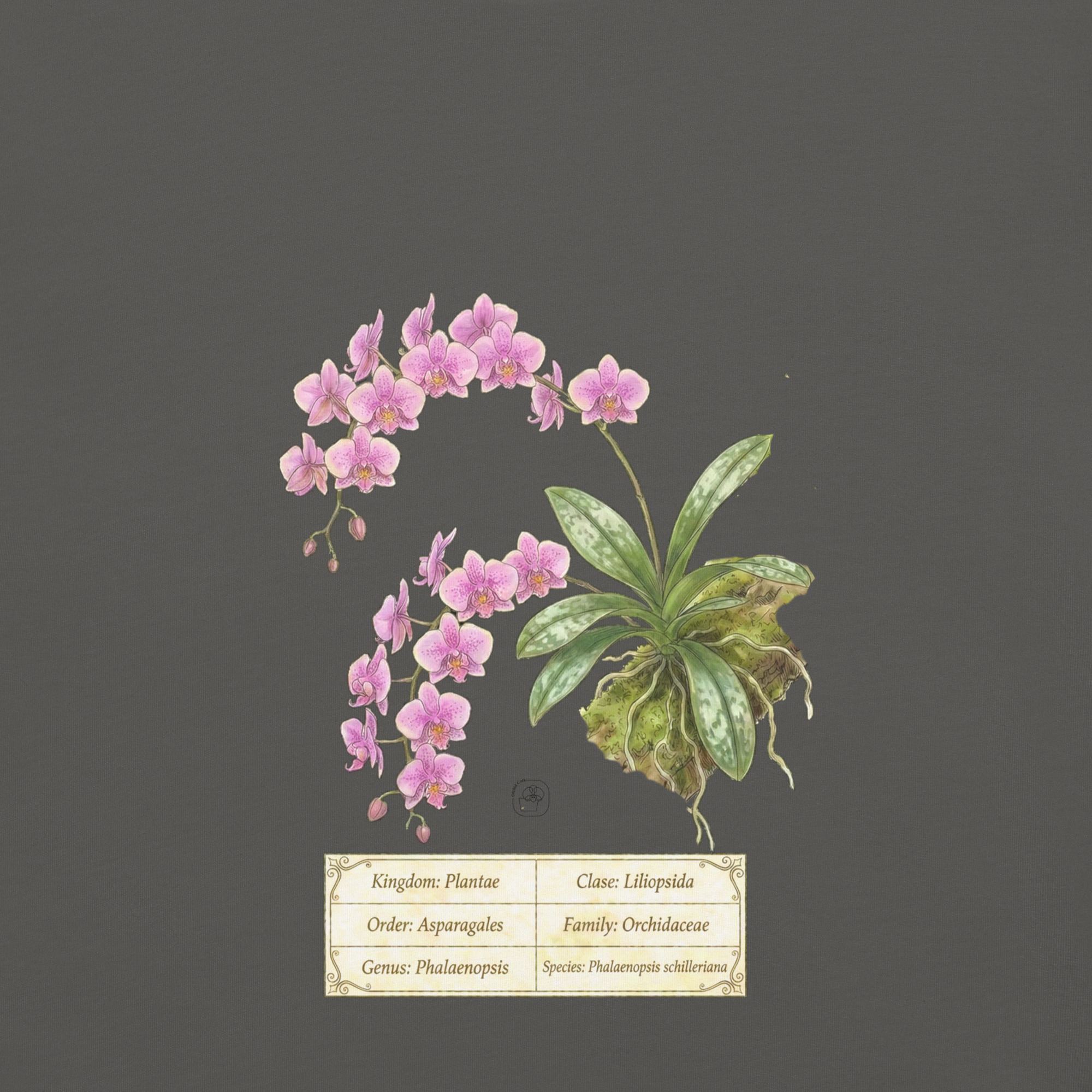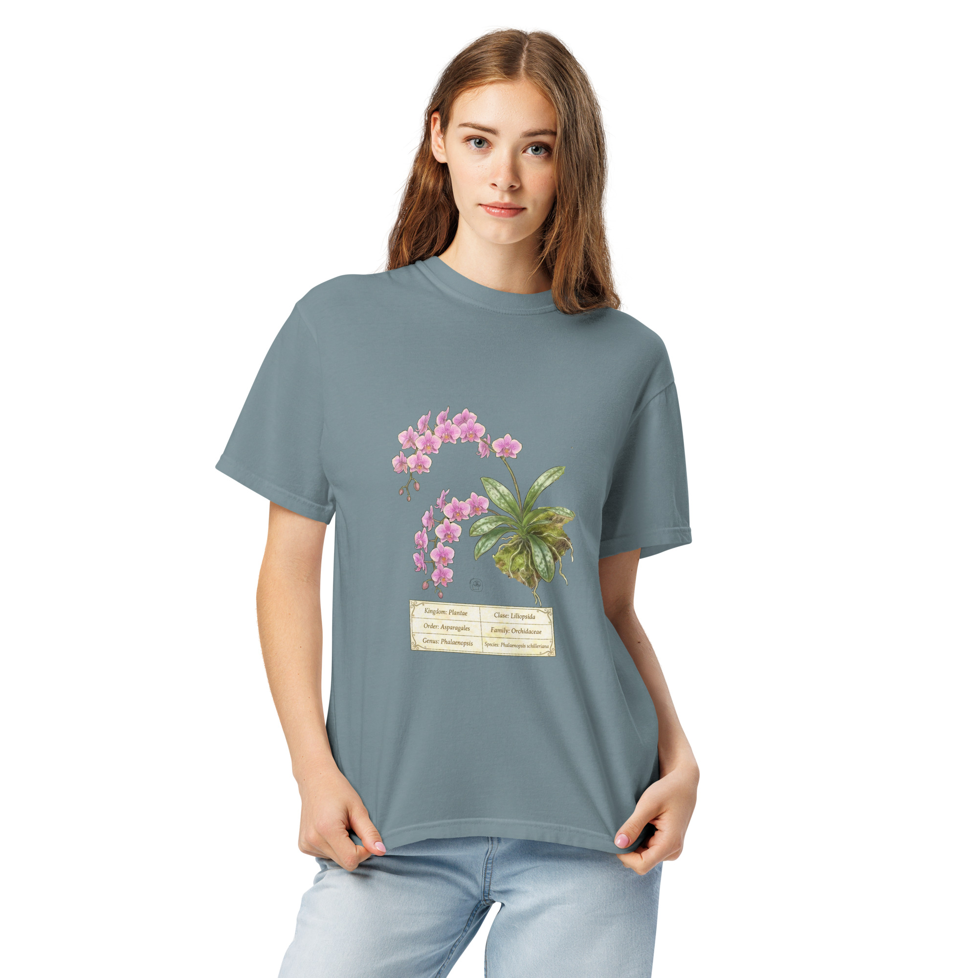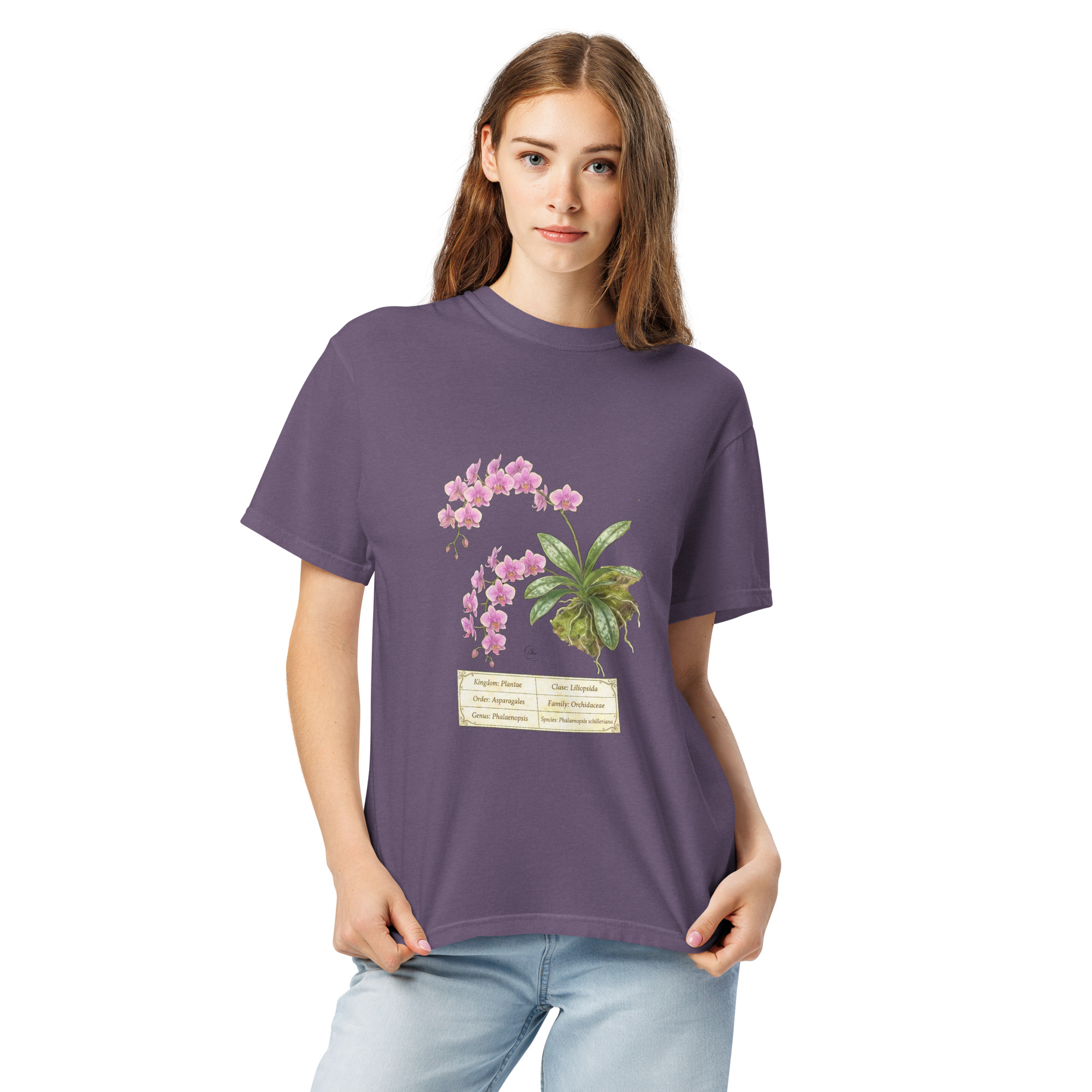 This t-shirt features a detailed illustration of Phalaenopsis schilleriana, inspired by 19th-century scientific botanical plates: clear compositions, precise linework, and a naturalistic aesthetic focused on the real structure of the plant.