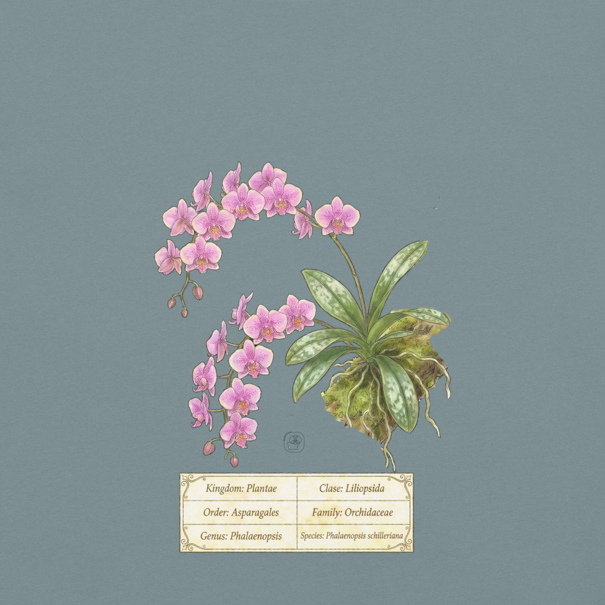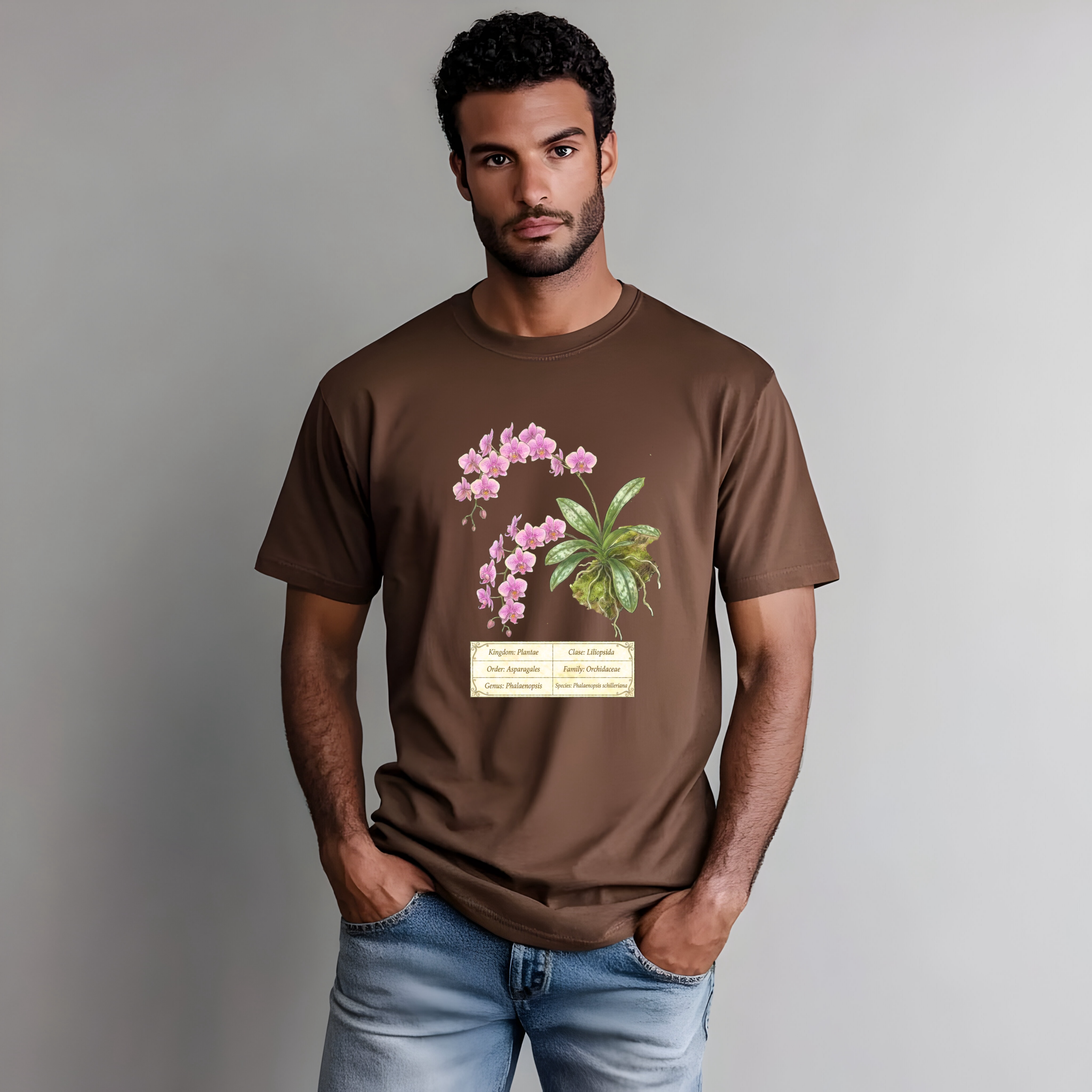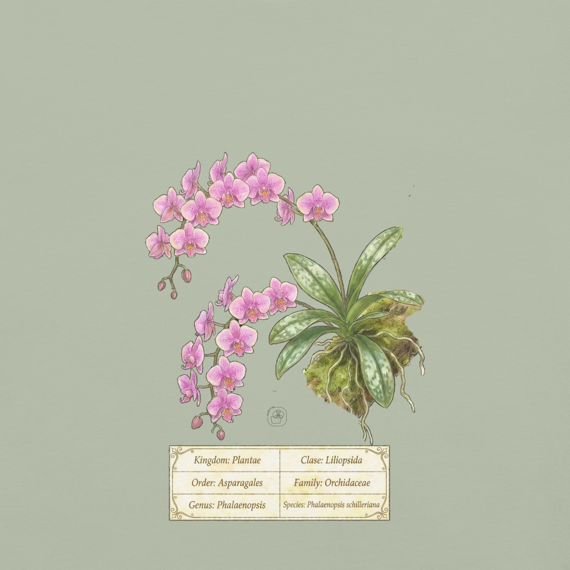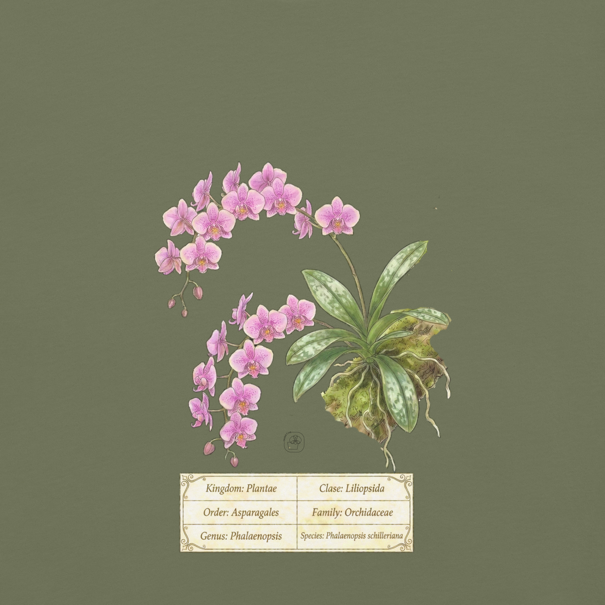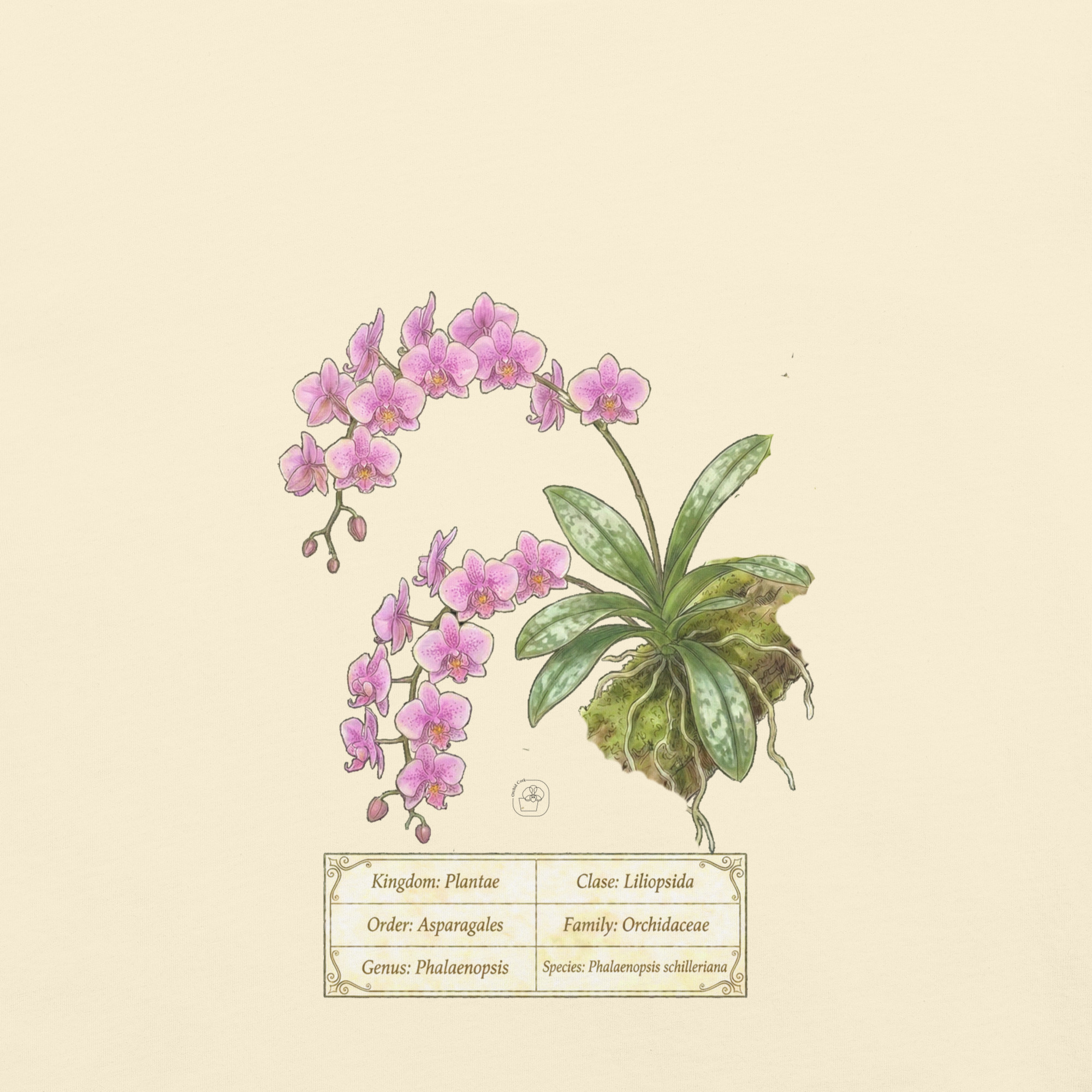 This t-shirt features a detailed illustration of Phalaenopsis schilleriana, inspired by 19th-century scientific botanical plates: clear compositions, precise linework, and a naturalistic aesthetic focused on the real structure of the plant.