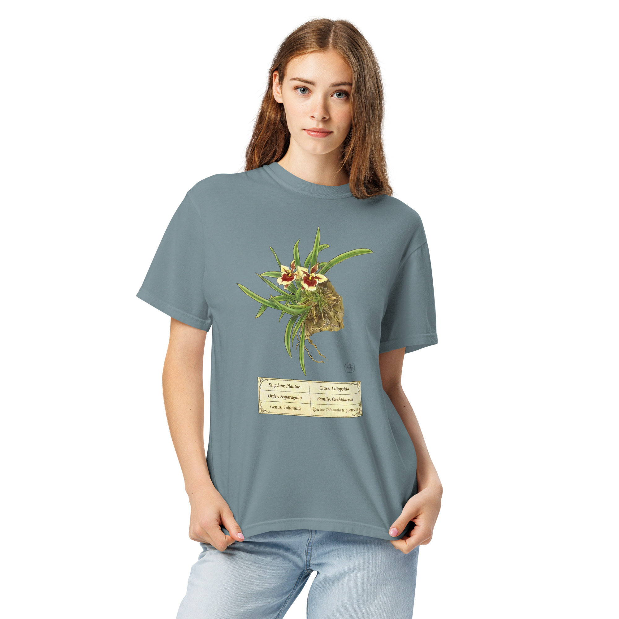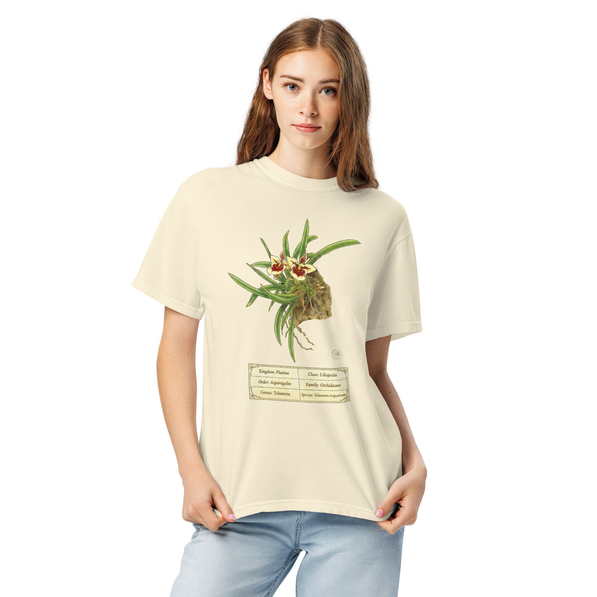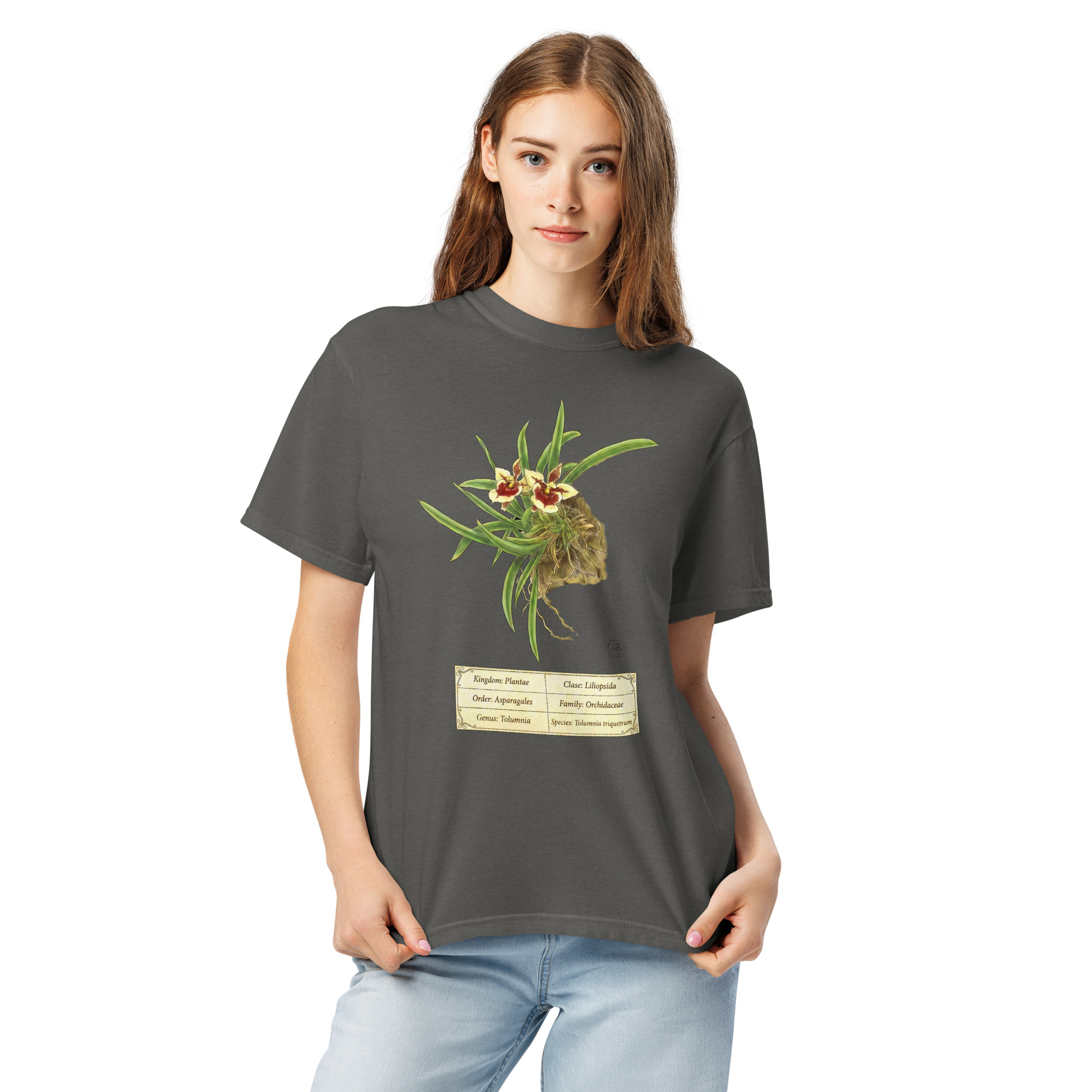 Tolumnia triquetrum botanical illustration on premium Comfort Colors 1717 heavyweight cotton. Vintage 19th-century scientific plate aesthetic. Professional DTG printing. Thick, structured, super soft and breathable. Perfect gift for orchid collectors and botanical enthusiasts.