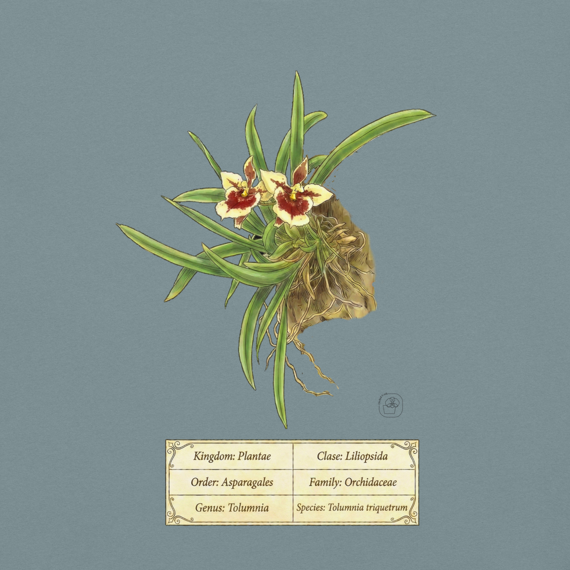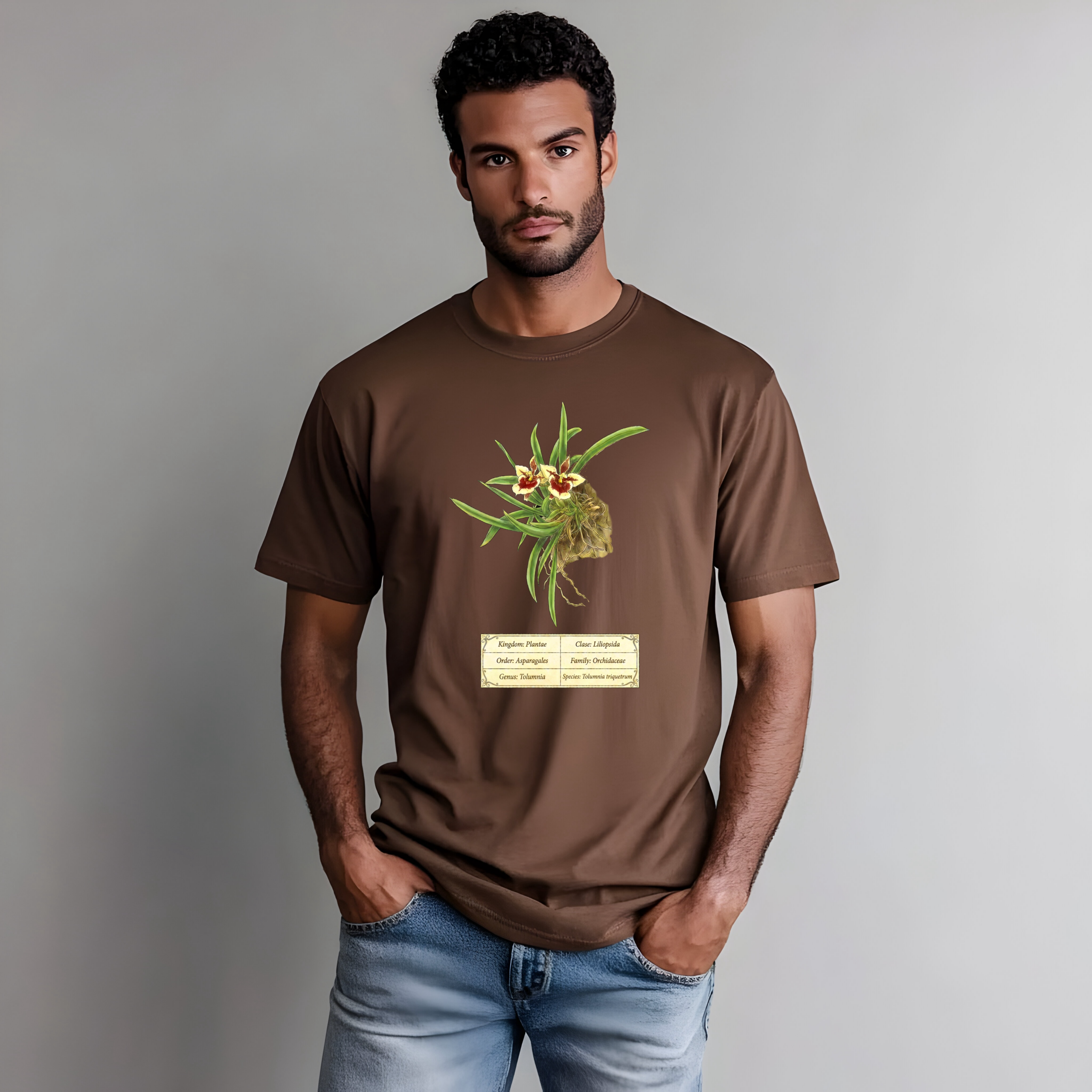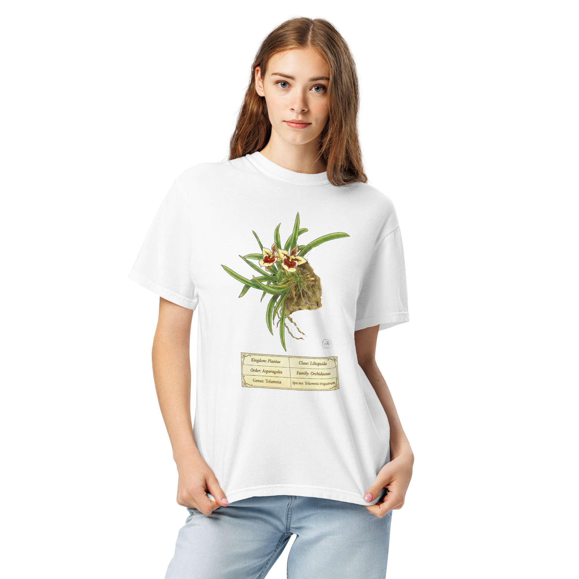 Tolumnia triquetrum botanical illustration on premium Comfort Colors 1717 heavyweight cotton. Vintage 19th-century scientific plate aesthetic. Professional DTG printing. Thick, structured, super soft and breathable. Perfect gift for orchid collectors and botanical enthusiasts.