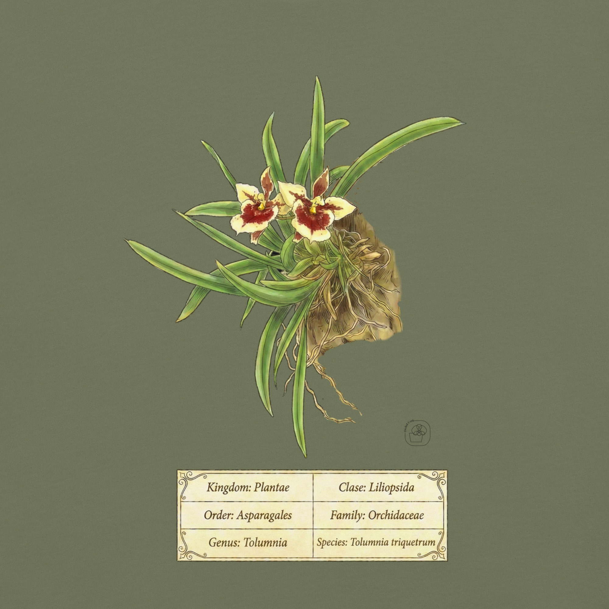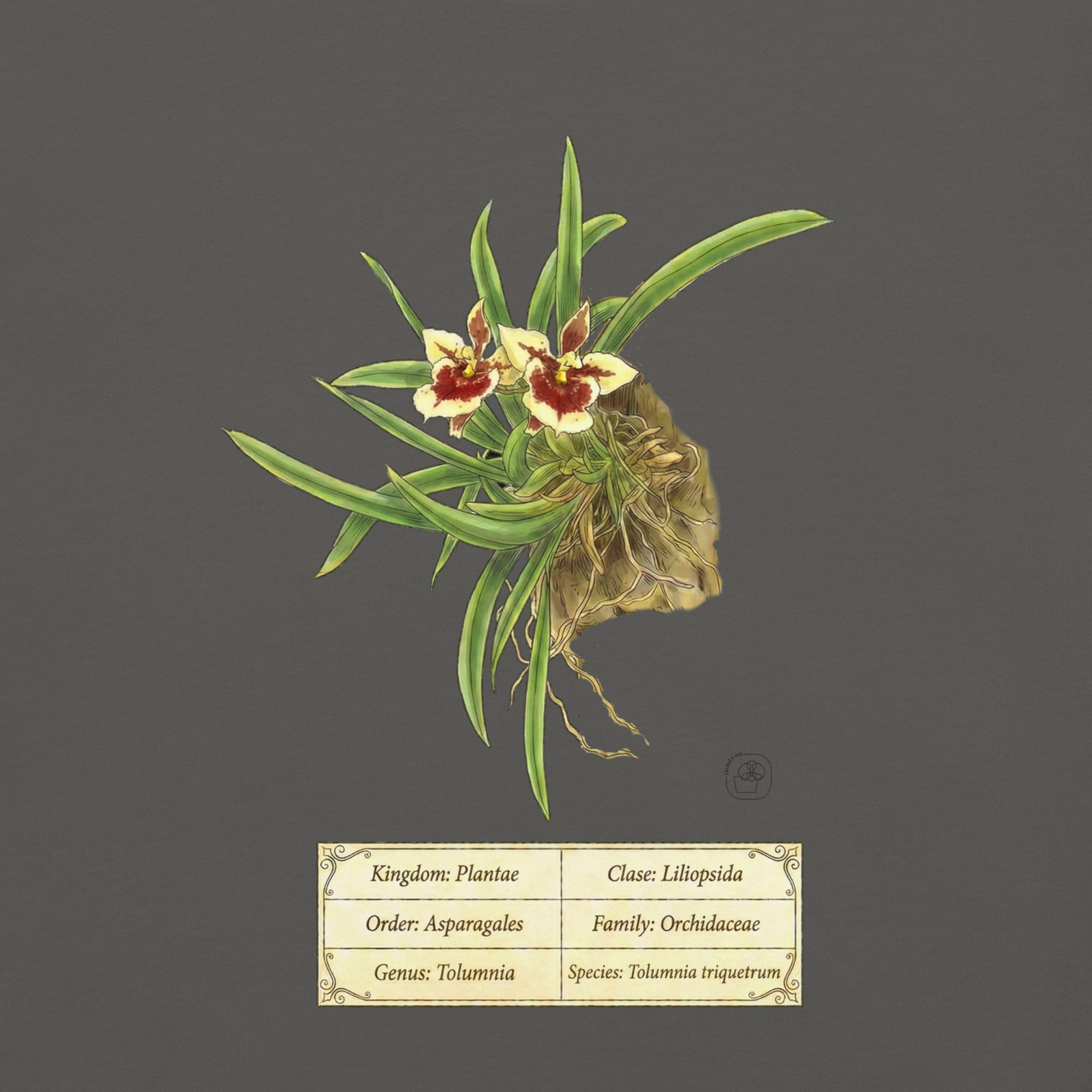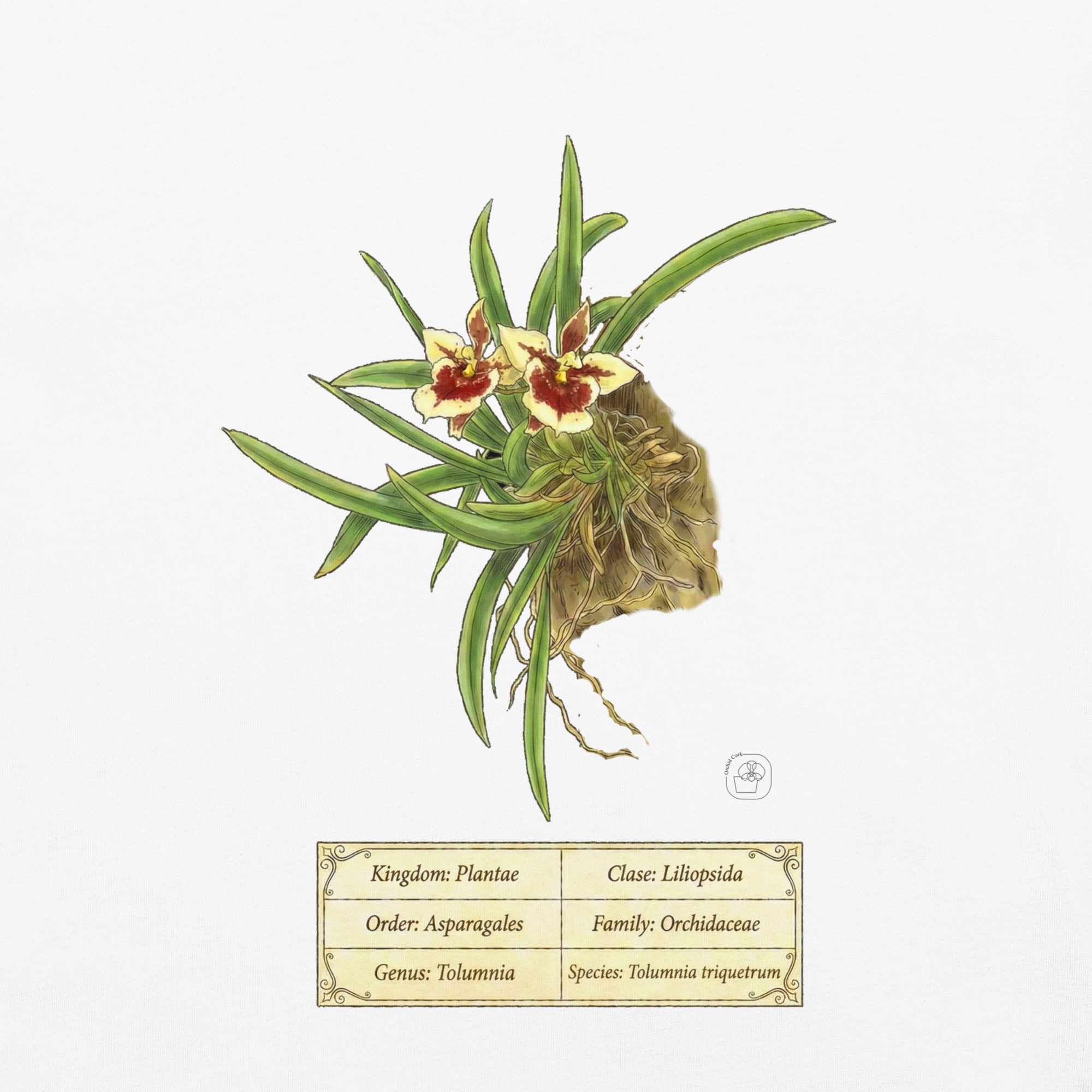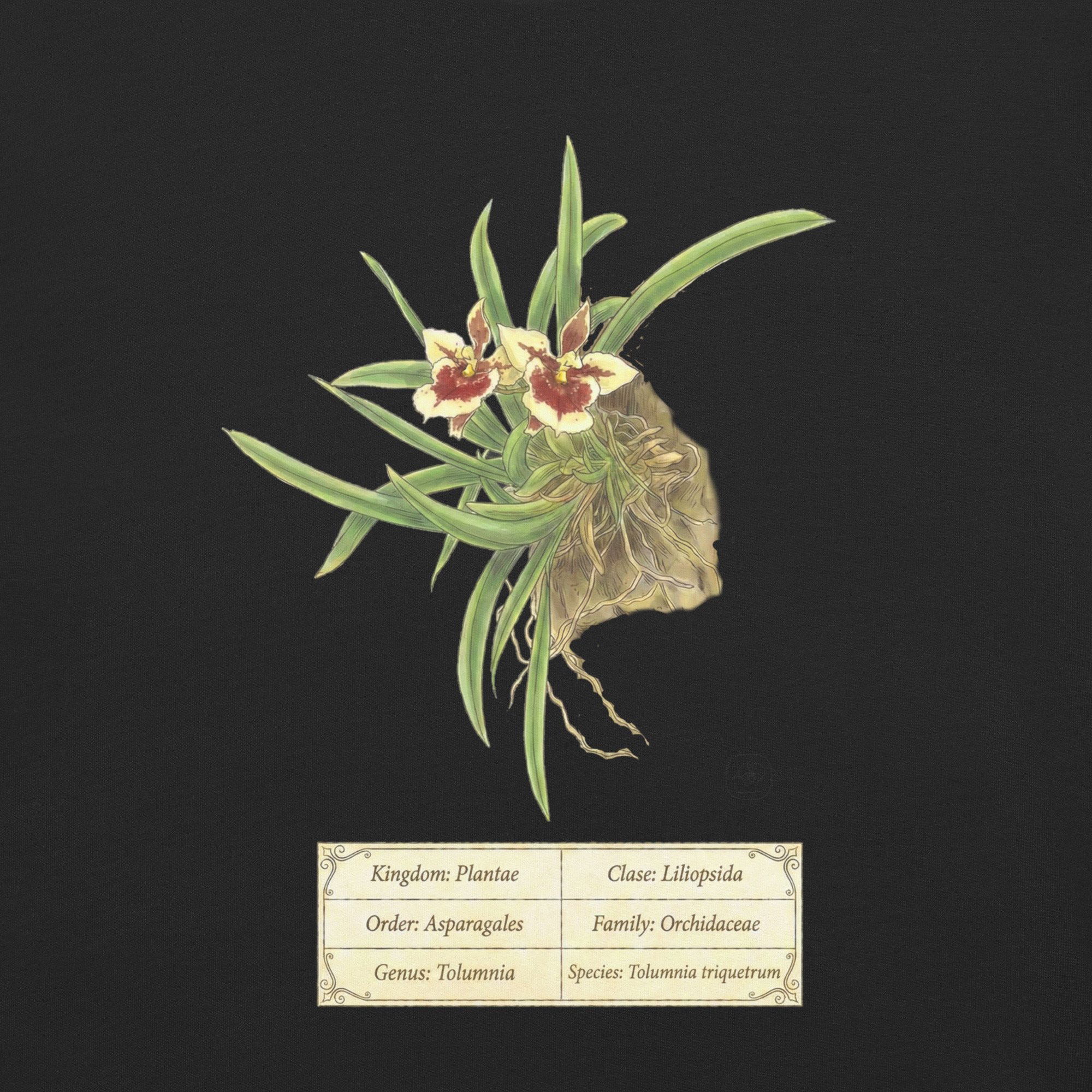 This t-shirt features a detailed illustration of Tolumnia triquetrum, inspired by 19th-century scientific botanical plates: clear compositions, precise linework, and a naturalistic aesthetic focused on the real structure of the plant.